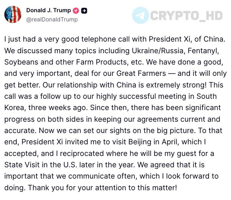 #торговаявойна 🇺🇸🇨🇳 Дональд Трамп: Я только что провел очень продуктивный телефонный разговор с Си Цзиньпином. Мы обсудили множество тем, включая Украину/Россию, фентанил, сою и другие сельскохозяйственные продукты и т.д. Мы заключили выгодную и очень важную сделку. Наши отношения с Китаем чрезвычайно крепки! Этот звонок был продолжением нашей очень успешной встречи в Южной Корее три недели назад. С тех пор обе стороны добились значительного прогресса в поддержании наших соглашений. Си Цзиньпин пригласил меня посетить Пекин в апреле, на что я согласился (❗️) и ответил взаимностью, пригласив его в США с государственным визитом позднее в этом году. Мы согласились, что важно часто общаться, чего я с нетерпением жду. Cryptо Headlines