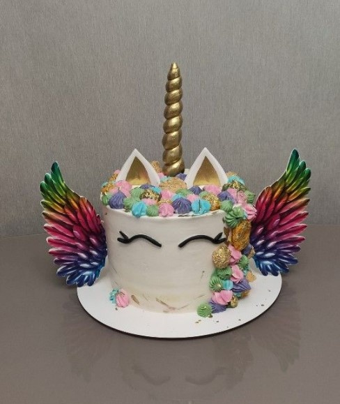 Заказали 3- килограммовый торт на 4 годика дочке. Пожелания по виду торта были выполнены. Это был торт в виде единорога с цветными крылышками. Торт был красивый, но невкусный. Сухие резиновые коржи и отдельно от них крем. Цельности у торта нет. Начинка была радуга, т.е. много коржей с кремом. Порезали торт, и он просто рассыпался на цветные куски бисквита и белые куски крема. В общем есть никто не захотел. Праздник был подпорчен!"