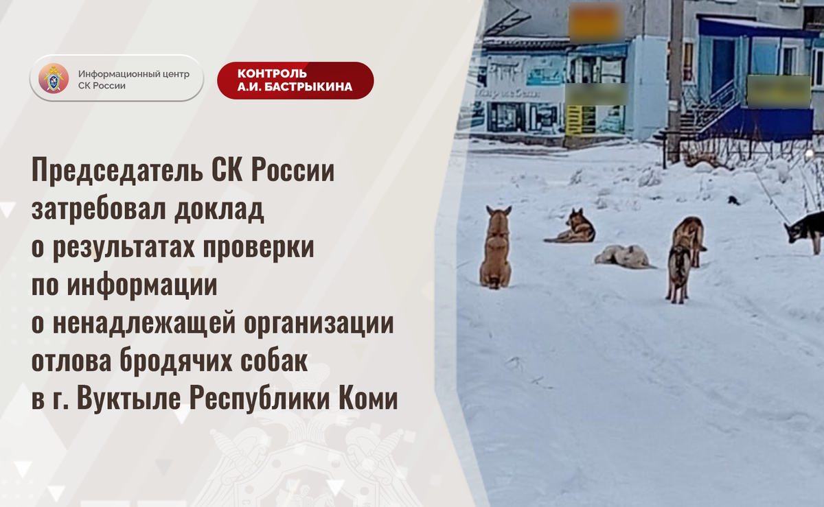 Председатель СК России затребовал доклад о результатах проверки по информации о ненадлежащей организации отлова бродячих собак в г. Вуктыле Республики Коми В социальной сети сообщается, что в городе Вуктыле Республики Коми на протяжении длительного времени вблизи одной из школ обитает большое количество безнадзорных собак, которые систематически проявляют агрессию в отношении прохожих. Так, в мае текущего года собаки набросились на восьмилетнего мальчика. Многочисленные обращения родителей, опасающихся за безопасность своих детей, в различные инстанции результатов не принесли. В СУ СК России по Республике Коми организована процессуальная проверка. Председатель Следственного комитета Российской Федерации Александр Иванович Бастрыкин затребовал у руководителя СУ СК России по Республике Коми Андрея Николаевича Исаева доклад о промежуточных результатах процессуальной проверки и принятом по итогам решении, поставив ее на контроль в центральном аппарате ведомства. #СледственныйКомитет #СКРо