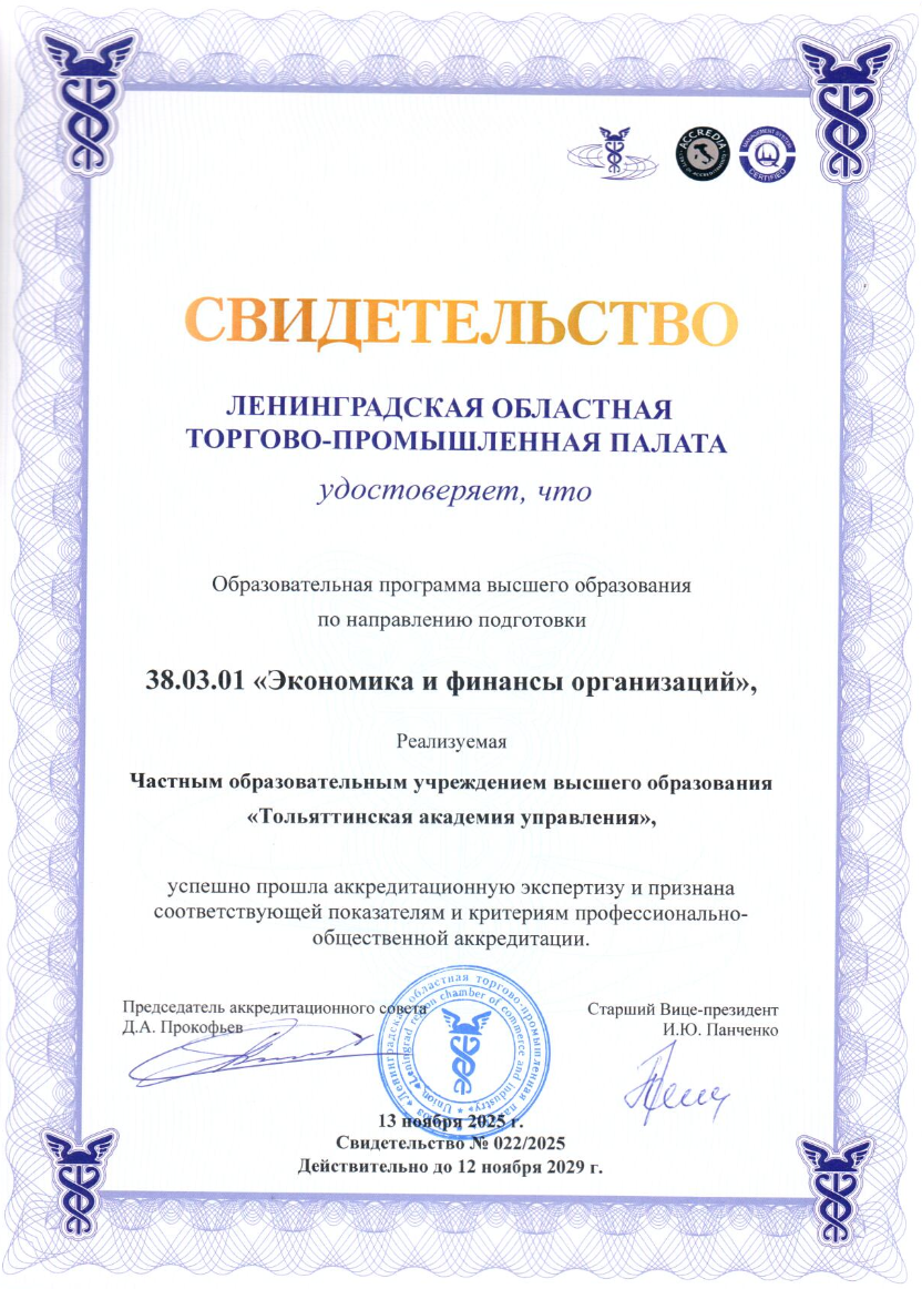 Три образовательные программы Тольяттинской академии управления успешно прошли профессионально-общественную аккредитацию (ПОА). Свидетельства были выданы двум программам бакалавриата — «Экономика и финансы организаций» и «Бизнес-аналитика в управленческой деятельности», а также магистерской программе «Управление проектом». Что такое ПОА? Важно отметить: речь идёт не о государственной аккредитации, которая удостоверяет соответствие программ федеральным государственным образовательным стандартам. Все программы ТАУ уже прошли её и полностью соответствуют требованиям российского законодательства в сфере образования. Профессионально-общественная аккредитация — это независимая оценка качества подготовки студентов, проводимая профессиональными сообществами, ассоциациями и объединениями. Это знак того, что образовательные программы ориентированы на практику, востребованы в регионе и соответствуют актуальным задачам экономики и бизнеса. Кто проводил оценку? Процедуру ПОА осуществила Ленинградс