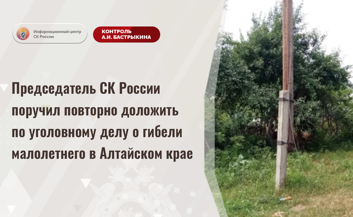 Председатель СК России поручил повторно доложить по уголовному делу о гибели малолетнего в Алтайском крае В приемную Председателя СК России А.И. Бастрыкина «ВКонтакте» обратилась жительница Алтайского края по вопросу несогласия с ходом установления обстоятельств гибели ее десятилетнего сына. В июне текущего года во время игры с друзьями на улице в селе Урюпино мальчик соприкоснулся с оборванным высоковольтным проводом линии электропередачи. От полученного удара током пострадавший скончался на месте происшествия. Отмечается, что ранее от жителей села в компетентные органы поступали обращения о ненадлежащем состоянии электросетей, однако мер реагирования не принималось. До настоящего времени никто к ответственности не привлечен. Указанная ситуация освещалась в сети Интернет. В СУ СК России по Алтайскому краю расследуется уголовное дело, по которому ранее А.И. Бастрыкин поручал представить доклад. Председатель Следственного комитета Российской Федерации Александр Иванович Бастрыкин поруч