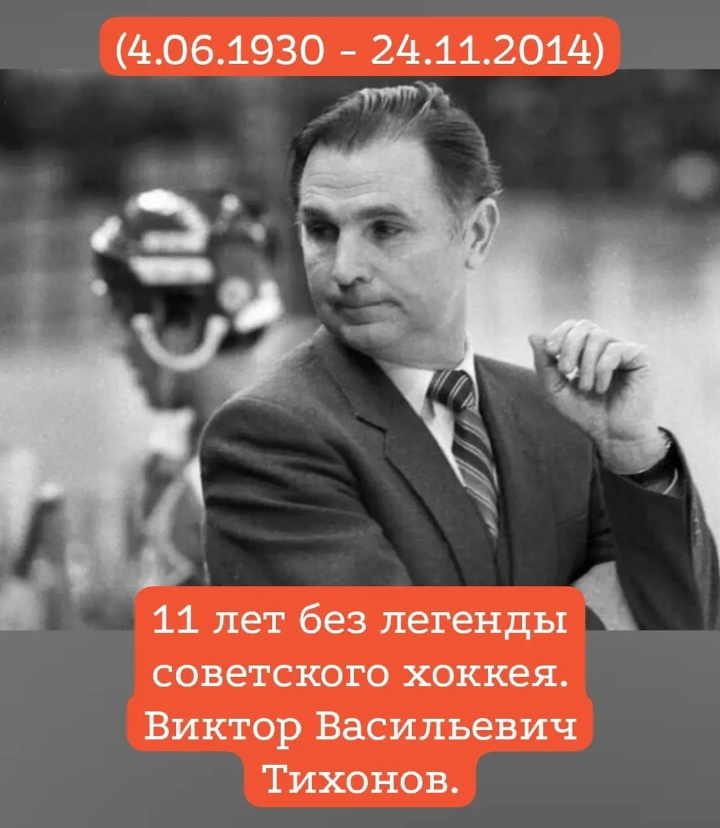 ⭐ Виктор Васильевич Тихонов — советский хоккеист и хоккейный тренер. 📍Биография Родился 4 июня 1930 года в Москве. В 1962 году окончил Государственный центральный институт физической культуры (ныне Российский государственный университет физической культуры, спорта, молодёжи и туризма). Скончался 24 ноября 2014 года на 85-м году жизни после продолжительной болезни... 🥹 📍Карьера В качестве хоккеиста: В 1949–1953 годах выступал на позиции защитника за ВВС МВО. В 1953–1963 годах — «Динамо» (Москва). Четырежды становился чемпионом СССР. В 1950 году присвоено звание мастера спорта. 🏒 После окончания спортивной карьеры работал тренером: Главный тренер команд «Динамо» (Рига, 1968–1977) и ЦСКА (1977–1996, 2002–2004). В 1977–1991 годах одновременно с работой в ЦСКА возглавлял сборную СССР по хоккею. 🥇 Достижения В качестве тренера: ⚡Трижды приводил сборную СССР и Объединённую команду к титулу олимпийского чемпиона (1984, 1988, 1992). ⚡Восемь раз — к титулу чемпиона мира.