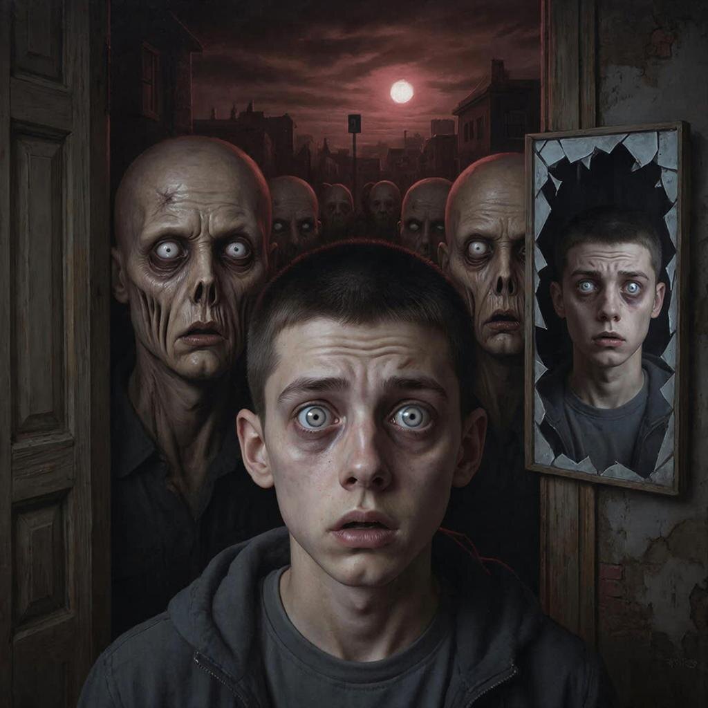 Артём всю жизнь фанател от параллельных вселенных. Собирал истории о странных местах, искал портал, который откроет путь туда. Однажды нашёл такую дверь — древнюю, деревянную, стоящую посреди старого дома на краю города. Только вот ручка её была чисто декоративной — дверью управляла не физическая сила, а вера. «Нужно представить себе переход», — подумал Артём, закрыл глаза и представил себя проходящим сквозь неё. Толкнул дверь — открылась легко. Он оказался снова в старом доме. Всё то же самое: пыль, грязь, мусор. Единственное отличие — тени исчезли. Поднял руку перед лицом — ничего. Ладони, тело — всё прозрачно. Выскочив наружу,он увидел город, похожий на свой, но совсем чужой. Здесь улицы залиты красноватым сумраком, небо украшено сразу двумя тусклыми солнцами, а жители… Люди ходили мимо, равнодушные ко всему вокруг. Артём подошёл ближе и ахнул: все были абсолютно лысые, без единого волоска. Вместо носа у каждого две длинные тонкие щели, похожие на продолговатые ноздри, тянущие