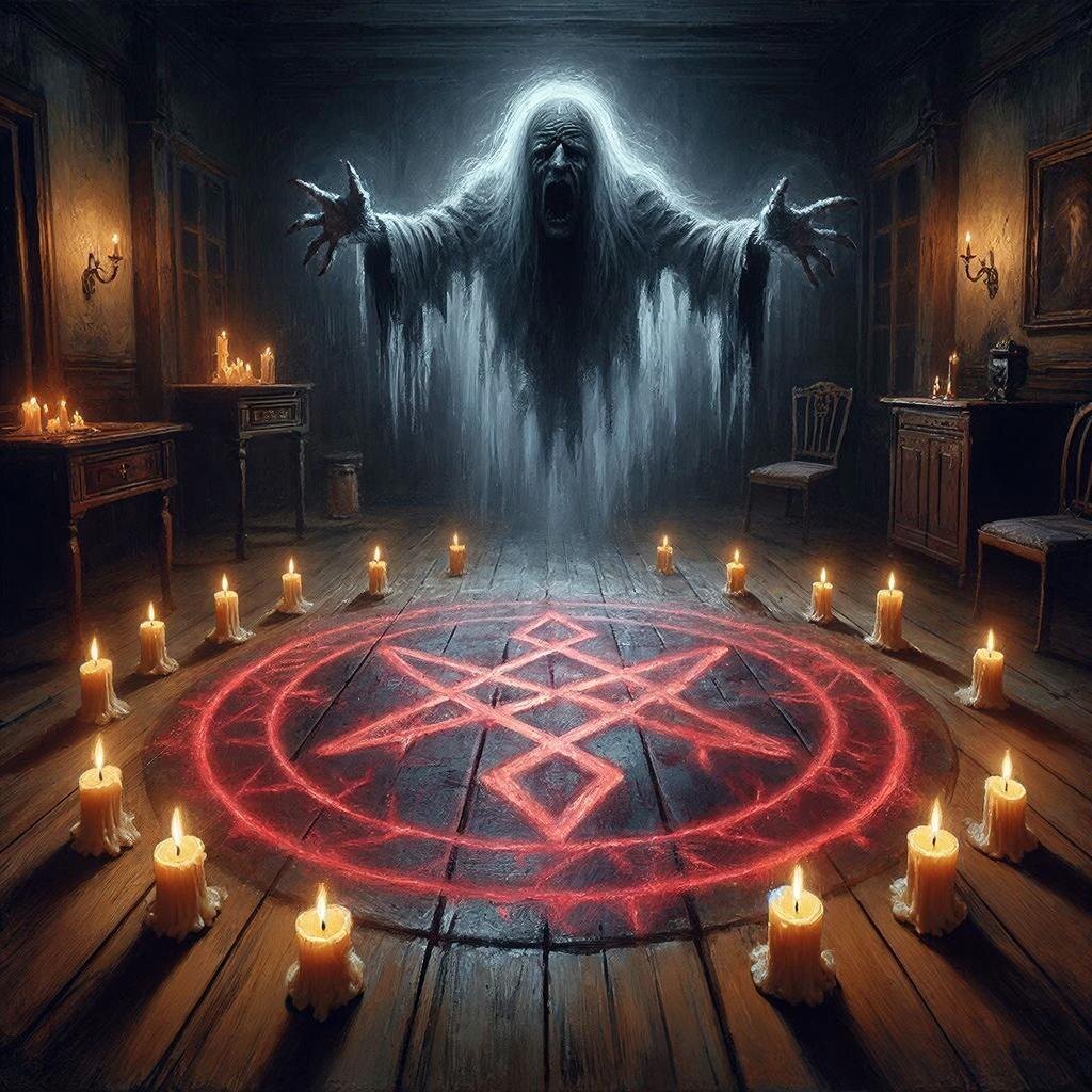 Внезапно, из центра руны пошел дым. Сначала тонкой струйкой, потом гуще и плотнее. Он колыхался, пульсировал, словно живой, и постепенно начал приобретать форму. Сначала неясный силуэт, затем – очертания человека. Лицо (а это был мужчина, причем старый мужчина), искаженное гримасой, казалось высеченным из камня. Глаза сверкали нечеловеческим светом, пронзая тьму, обжигая нас взглядом. В комнате запахло серой, воздух наэлектризовался, и каждый из нас почувствовал животный страх, проникающий в самую душу. Правильно мне велел дух из статуи: "Уходи!"