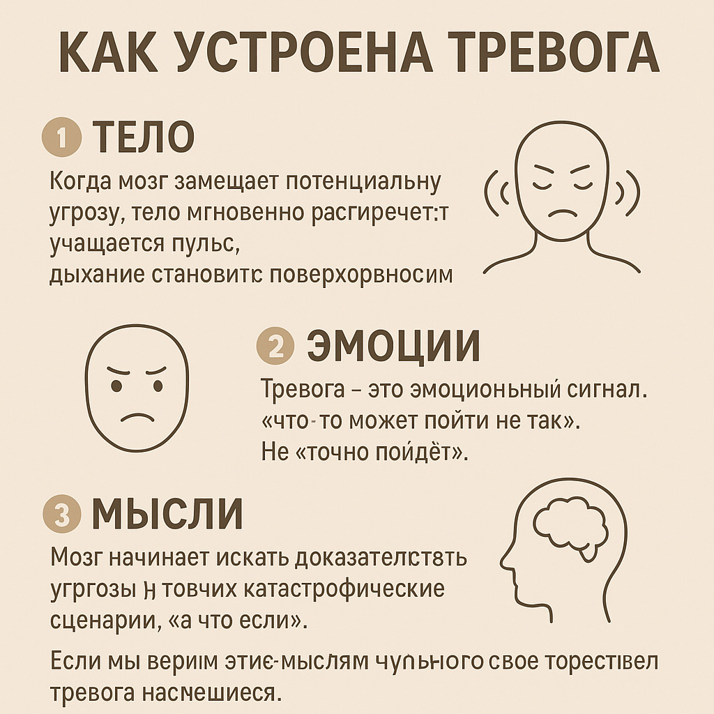 Страх высоты, темноты, одиночества, незнакомцев — всё это было не ошибкой, а преимуществом. Мозг эволюционно устроен так, что лучше “ошибиться в сторону опасности”, чем пропустить угрозу. Поэтому людям свойственно: Это та «безопасность» заложена в нас природой. Тревога — это не одно чувство. Это взаимодействие тела, эмоций и мыслей.