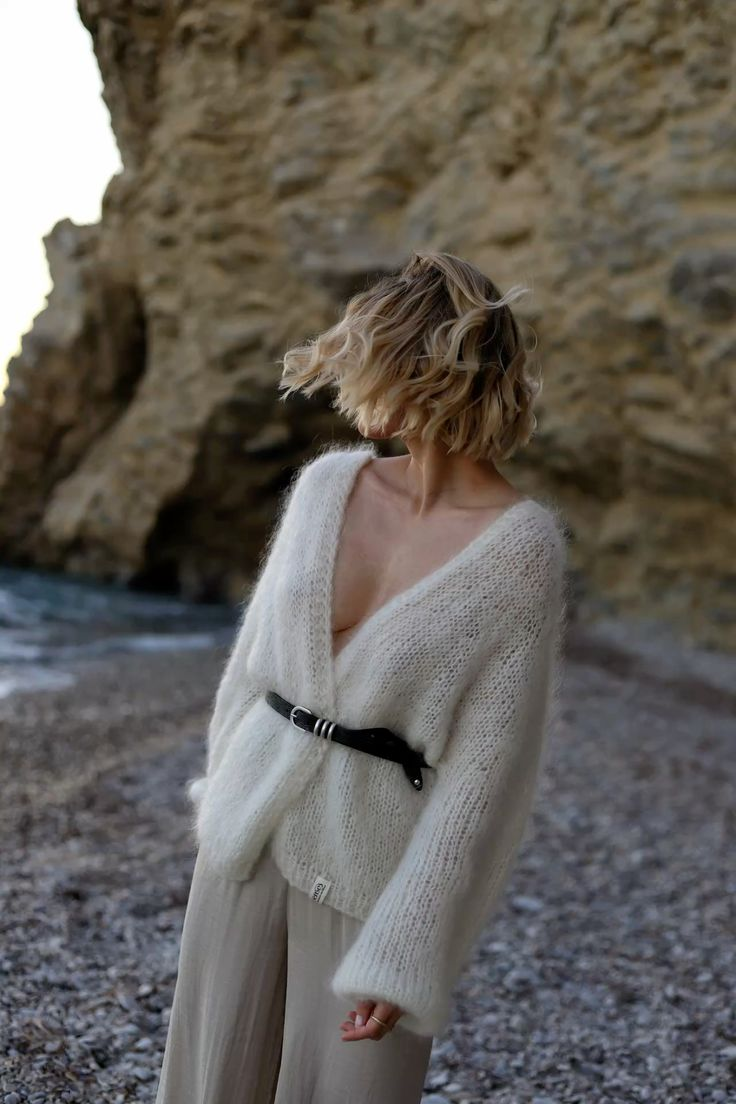 - Символ безупречности. Белый песок — выбор для тех, кто ценит минимализм и безупречный крой. Свитер-реглан, платье-футляр простой вязки, длинный кардиган-паутинка — в этом цвете они приобретают скульптурную выразительность. Здесь важна каждая петля, каждая линия.