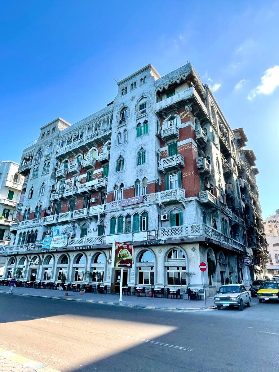 У Нагиба Махфуза, самого известного египетского писателя и лауреата Нобелевской премии по литературе, есть роман ‘Пансион “Мирамар” — один из немногих, переведённых на русский. Основное действие в нём разворачивается в старом пансионе на набережной в Александрии. Был ли у Махфуза в голове прототип, когда он писал свой ‘Мирамар’ или нет — не знаю, но на набережной в Александрии действительно есть довольно знаменитое здание под названием ‘Мирамар’, построенное в 1920-е годы в стиле ар-деко с исламскими мотивами. И внутри этого здания и правда находится пансион, только называется он Philip House. Мне как-то довелось в нём остановиться. Как и в романе, пансион занимает один из этажей дома, на остальных находятся квартиры, конторы и кафе. Я приехала туда без брони, поднялась на старинном деревянном лифте с коваными дверьми на 5-й этаж и позвонила в звонок. Мне открыла женщина в платке, совершенно не говорившая по-английски. Внутри, как и во многих местах в Александрии, портал в другую эпо