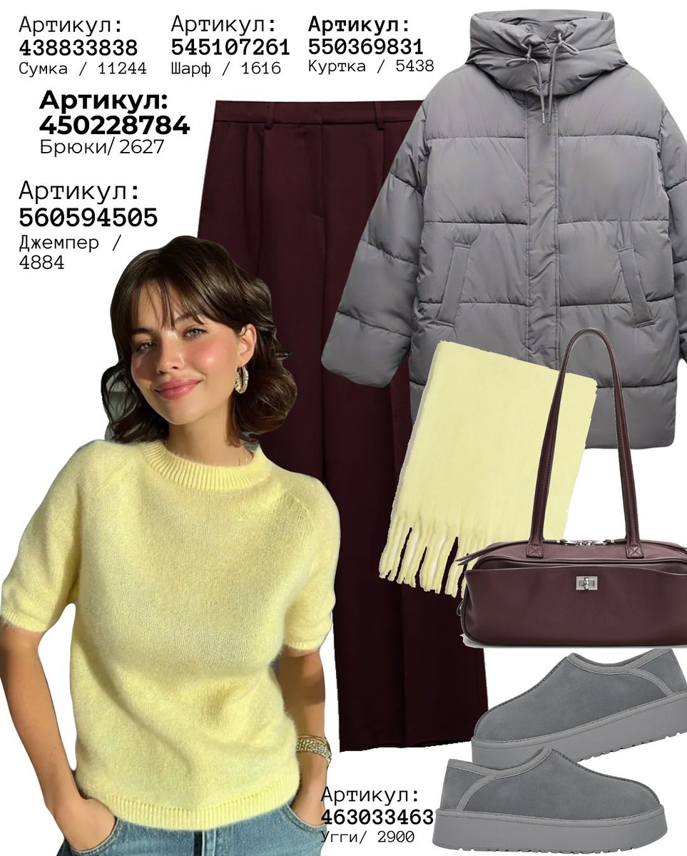Зима — лучший сезон для многослойности, уютных фактур и глубоких благородных оттенков. Когда правильно собрать образ, он не только согревает, но и подчёркивает вкус, создаёт настроение и ощущение гармонии. В этой статье — два продуманных зимних комплекта с Wildberries, где каждая вещь подобрана по оттенку, фактуре и назначению. Всё разобрано подробно, по порядку и с советами стилиста. Образ №1 — Мягкая зима в тёплых ягодных и серых оттенках Этот комплект сочетает в себе лёгкость пастельного, насыщенность винного и спокойствие серого. Получился уютный образ для города — прогулок, работы, учёбы или неспешных выходных. Мягкий лимонно-жёлтый оттенок заметно освежает лицо и делает весь образ теплее. Фактура пушистая, лёгкая, при этом сам джемпер держит форму, не создавая лишнего объёма. Рукав средней длины делает его универсальным для зимних образов — можно надеть под пуховик, не создавая ощущения многослойности. Совет стилиста: такой оттенок красиво работает на контрасте с тёмными брюками