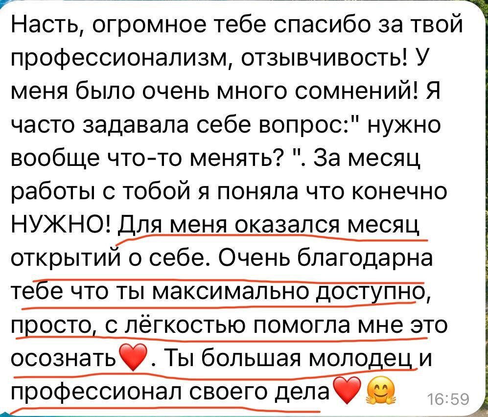 А это чудесный отзыв от моей подопечной, с которой мы недавно завершили месяц работы🥰 Она большая умница! И за такой короткий срок мы успели сделать очень много. Просто посмотрите⬇️ 🌿снизился вес на 4 кг 🌿стала лучше слышать и понимать своё тело 🌿стала больше верить в себя и свои силы и позволила себе делать то, что хочется из любви к себе 🌿стало больше энергии и настроения, увеличилась физ активность в радость 🌿ушли частые перекусы, еда на ходу, еда от скуки и недостатка эмоций, кусочничество, еда «за компанию». Еда стала более полноценной, красивой и разнообразной 🌿многие симптомы ЖКТ ушли - почти нет вздутия, стул более стабильный, появилось чувство легкости. Просто ВАУ 🤩 Я горжусь каждым пунктом и с легкостью отпустила ее в свободное плавание с напутствием. До следующей нашей консультации через время🥰 Меня каждый раз переполняет чувство радости за моих подопечных. Когда у вас получается и вы достигаете цели 🎯 я счастлива ♥️ Запишись на БЕСПЛАТНУЮ диагности