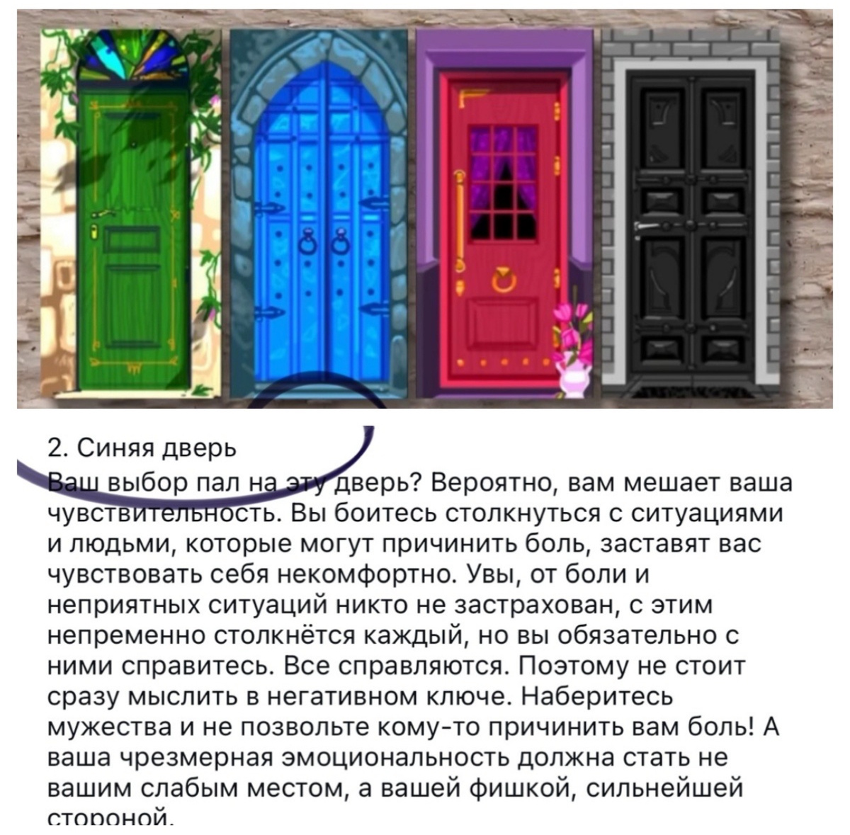 Два выходных дня я работала на компьютере, дописывала в срочном порядке статью, и сегодня решила просто отдохнуть: валяюсь на подушках, пишу посты, генерирую фотографии, смотрю сериал. Иногда нам нужна лень для разгрузки. Вот и решила пройти один из тех забавных онлайн-тестов в VK, которых там полно. Не ожидала ничего особенного – просто хотела немного развлечься. Но результат мне показался настолько точным, что натолкнул меня на это размышление, что иногда просто может раскрыть истину. Что же такого особенного в этом простом тесте: «Выбери дверь, которая тебе нравится»? Мой выбор показал, что я чувствительный человек с развитым творческим началом. Я всегда знала об этих своих качествах, но никогда не думала, что именно такие мелочи, как выбор цвета или формы, могут показать мою сущность. Более того, тест выявил некоторые аспекты моей личности, о которых я даже не задумывалась раньше. Это словно маленький шаг навстречу самой себе, который может изменить многое в жизни. А вы проходите