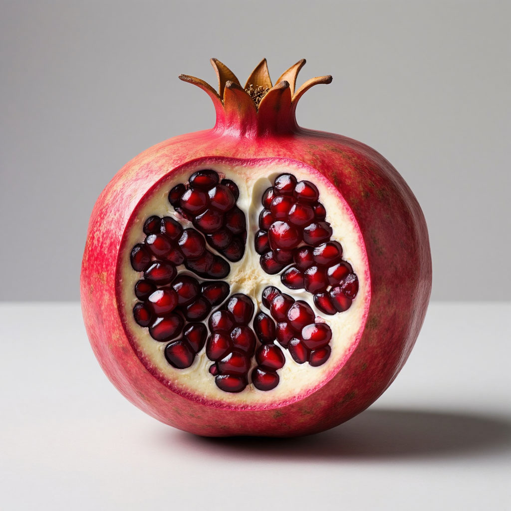 Гранат — плотный плод с твёрдой кожурой, внутри которого сотни сочных зёрен с лёгкой кислинкой и терпкостью. Зёрна отделены друг от друга тонкими перегородками‑плёнками, которые немного горчат — их обычно не едят. Гранаты выращивают в тёплых регионах: на Кавказе, в Средней Азии, Турции, Иране, Испании, Италии, Греции. Сезон сбора — с сентября по январь, в зависимости от сорта и климата. Гранат умеренно богат витаминами и антиоксидантами. Его сок слегка тонизирует, а зёрна дают чувство насыщения без избытка калорий. Умеренное употребление может поддерживать общий тонус — но это не лекарство, а часть разнообразного рациона.