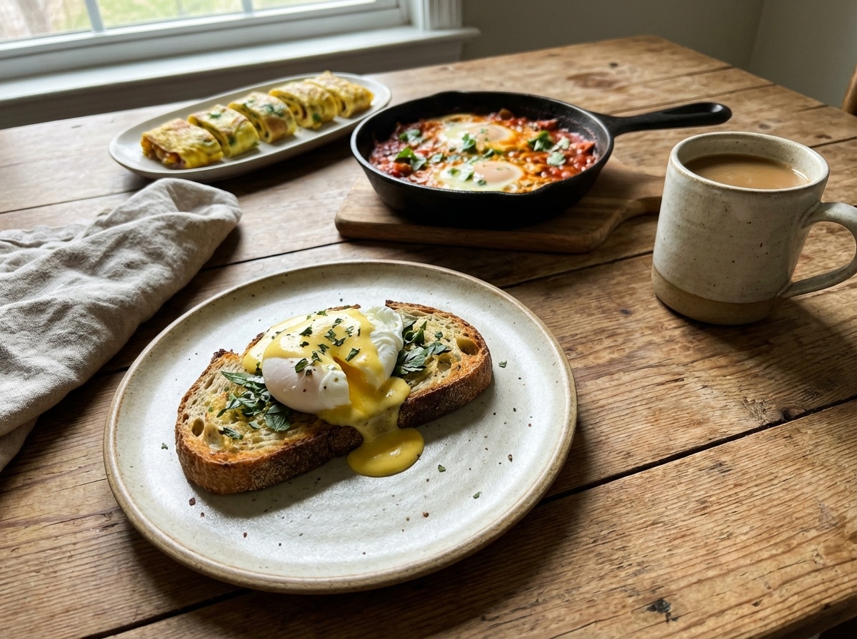 Ниже три варианта завтрака из самых простых вещей — яиц, хлеба, пары овощей и йогурта/сметаны. Всё готовится на обычной кухне, без профессиональных навыков, но выглядит и ощущается «как в кафе».