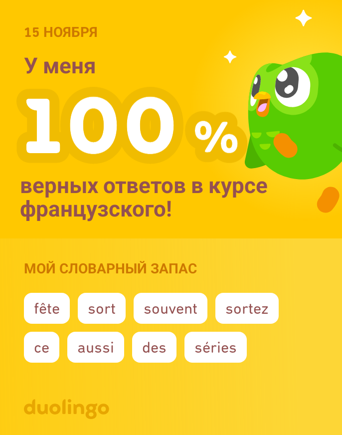 Уже более 10 лет я преподаю английский и немецкий, и вот я решила, наконец, освоить ещё один язык и начала изучать французский с Duolingo.🇫🇷 Очень долго меня спрашивали, есть ли смысл учить английский в приложении Duolingo, и всё это время единственное, что я знала о дуолинго, были приколы про сову. Это одна из причин, почему я решила попробовать именно это приложение: не сова, нет) понять, наконец, как там всё устроено. Сейчас поделюсь своими впечатлениями. Вторая причина: вдруг я поняла, как много людей вокруг занимаются в дуолинго, а это уже целое коммьюнити, в котором можно обсуждать свой опыт. Отдельно отмечу, что к числу этих людей относятся трое детей в возрасте от 9 до 11 лет, которые на троих учат 5(!) языков💪 Почему французский? Когда-то в начале десятых годов я начинала учить несколько языков: французский, итальянский, испанский, португальский - вместе с передачей "Полиглот" на канале Культура. Английский и немецкий я смотрела просто как сериал, а по остальным курсам