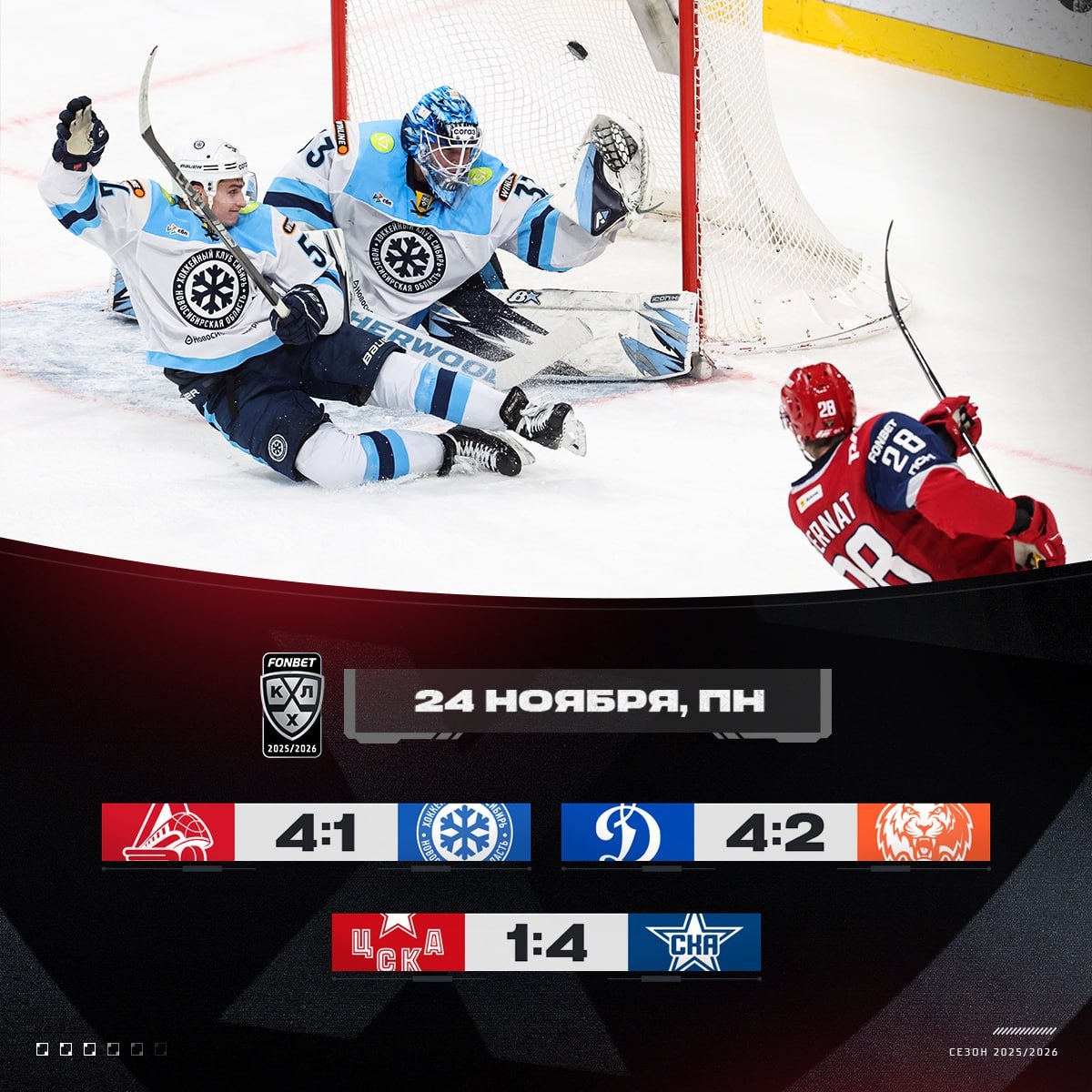 Вчерашние матчи КХЛ не были про сухие цифры. Они были про накал, эмоции и хоккей, который ощущается всем телом. Точные броски, эффектные дубли, моменты, когда кажется, что всё вот-вот изменится — такие дни хочется переживать снова и снова. СКА — ЦСКА 4:1 Армейское дерби держало в напряжении с первых секунд. Хайруллин дважды забил, задав тон всему матчу. ЦСКА пытался сопротивляться, но атаки СКА разрушали их планы одну за другой. Победа с разницей в три шайбы — цифры сухие, но накал на льду ощущался в каждой секунде. Локомотив — Сибирь 4:1 Ярославцы выдали почти безупречную игру. Гернат оформил дубль, а команда использовала моменты максимально рационально. Сибирь боролась до последнего, но оборона «Локо» была непробиваемой. Каждый гол ощущался точным ударом в сердце матча. Динамо — Амур 4:2 Московское Динамо контролировало ход игры почти с первых минут. Сикьюра дважды забил, а бело-голубые играли с холодной точностью. Амур пытался сопротивляться, но силы были неравны. Каждое