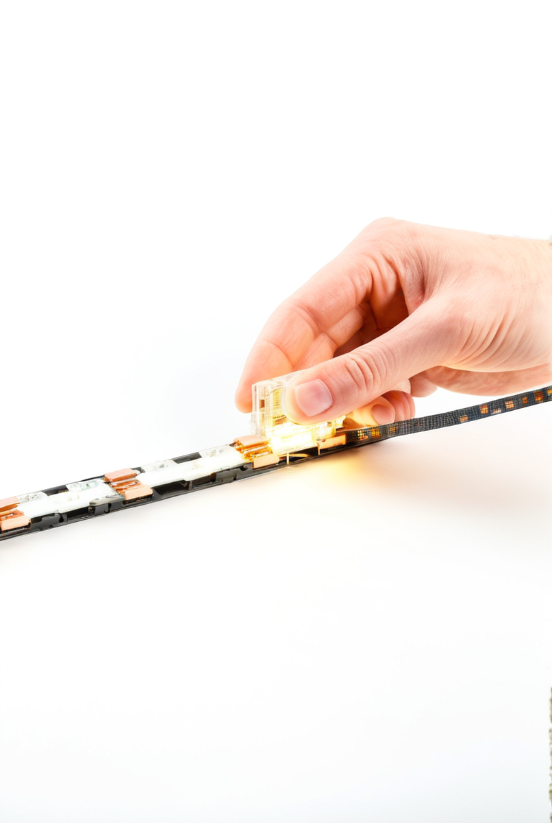 Да, это обязательная процедура! Быстрозажимной Г-образный соединитель работает по принципу прокалывания контактов. Силиконовое или эпоксидное покрытие не позволит зубцам коннектора достичь медной токопроводящей площадки. Для правильного монтажа LED ленты аккуратно срежьте несколько миллиметров защитного слоя с конца ленты острым ножом, полностью обнажив контактную площадку. Только после этого выполняйте стыковку отрезков. Невыполнение этого шага — основная причина неудачного соединения без пайки с влагозащищенными лентами.