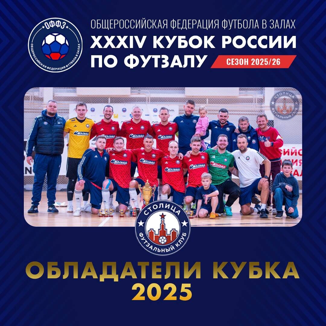 В воскресенье 23 ноября, в спортивном комплексе «Олимп» в подмосковной Ивантеевке прошел финал Кубка России по футболу в залах под эгидой Общероссийской Федерации Футбола в Залах, в котором «Столица» уверенно обыграла, ФЗК «Динамо» со счетом 8:2. Не смотря на крупный счёт, встреча держала всех участников большого праздника футзала в напряжении до последних минут. Столичные были успешнее в реализации, что и позволило завоевать трофей. В составе «Столицы» забитыми мячами отметились: Ширяев Андрей ‘1, ‘22, ‘29(АГ) Сергеев Сергей ‘5, ‘31 Гончаров Владимир ‘9 Дроздов Евгений ‘27, ‘38 Коротаев Игорь ‘35 У Динамовцев отличился Владислав Летучев, реализовав девятиметровый удар на 38-ой минуте. Хочется поблагодарить Федерацию Футбола в Залах, команды и их руководство за футбольный праздник! Ждем с нетерпением старта нового сезона регулярного чемпионата!