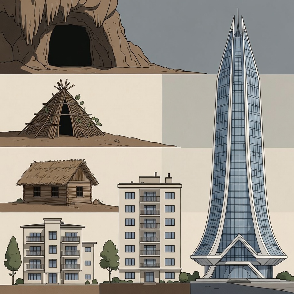 Недвижимость — это отражение всего, что происходит с обществом. Когда экономика растёт, растут города. Когда общество нервничает, оно прячет деньги в бетон. Когда появляются новые технологии, меняется не только быт, но и сами пространства, в которых мы живём. И если смотреть на эволюцию человечества честно, то становится ясно: мы всегда занимались одним и тем же — создавали себе укрытия всё более сложной формы и называли это прогрессом.