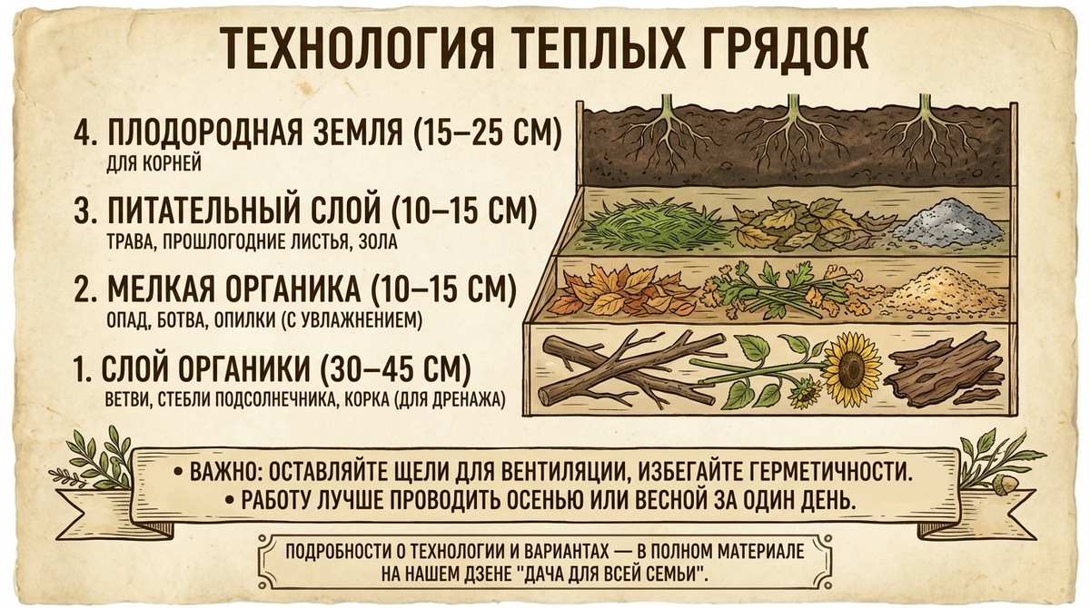 Что у меня сошлось по итогу. Четыре слоя за один день собрать реально, если всё подготовить заранее, нарезать ветки, подвести воду и материал. Разница по температуре есть и ощутимая в начале, это подтверждается прямыми измерениями. Толщина нижнего слоя в 40 сантиметров себя оправдала, но не как догма, а как ориентир для средней полосы. Опилки и щепа работают, если их не сыпать монолитом, а смешивать с ботвой и землёй. Навоз лучше перепревший и глубже, ближе к второму слою. То, что остаётся под вопросом, это сроки старта в совсем холодных регионах, там уже многое решает укрывной материал и организация проветривания, иначе можно разбудить микробы, а растения ещё не готовы.