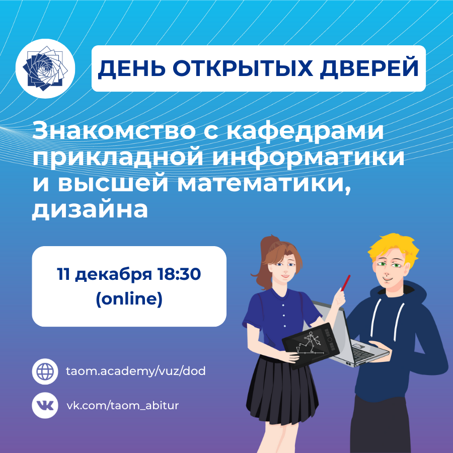 11 декабря Тольяттинская академия управления приглашает всех желающих на третий в этом году День открытых дверей в онлайн-формате! Встреча пройдет на платформе SberJazz, начало в 18:30. Ректор ТАУ, заведующая кафедрой прикладной информатики и высшей математики Наталья Стрекалова и проректор по научно-исследовательской работе, заведующая кафедрой дизайна Елена Вишневская расскажут о профильных дисциплинах, практических навыках и перспективах обучения, а также о том, что необходимо для поступления на направления подготовки 09.03.03 «Прикладная информатика» и 54.03.01 «Дизайн». Как принять участие? Вся информация о днях открытых дверей в ТАУ - на сайте https://taom.academy/vuz/dod.