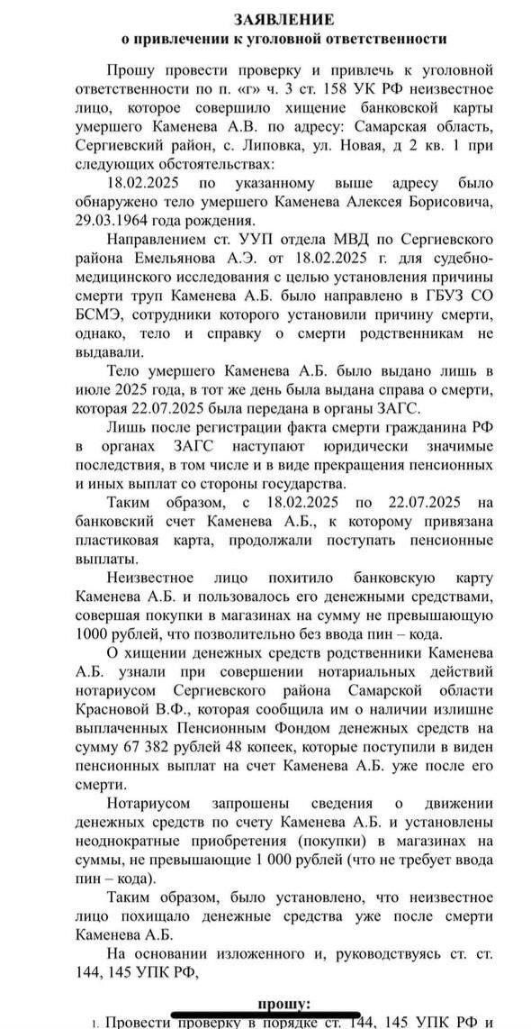 👁 Никогда такого не было… История со смертью Алексея Каменева тот случай, когда смерть человека оказалась дешевле литра кефира, а система умудрилась сделать всё, чтобы на этом ещё и кто-то подзаработал. Напомню, тело мужчины нашли 18 февраля в Липовке. Документы и карты были при нём. Казалось бы, установили смерть, оформили, выдали тело родственникам. Но нет…В Самарской области всё сложнее, потому что тело попало туда, где «всё под контролем» — в систему БСМЭ, которой руководит Алексей Манцагов Тут и началось самое интересное. Врачебные документы не выдаются, тело не отдаётся, родственникам никто ничего не сообщает. БСМЭ официально провело исследование, но справку, ту самую бумажку, без которой человек юридически как бы не умер, никто выдать не удосужился. Труп лежал «под ведомством» Манцагова почти пять месяцев. По итогу тело почившего отдали только в июле. И только тогда, вспотев и чертыхаясь, ЗАГС внёс запись о смерти от 22 июля Ну то есть Каменев всё это время «отдыхал» в холод