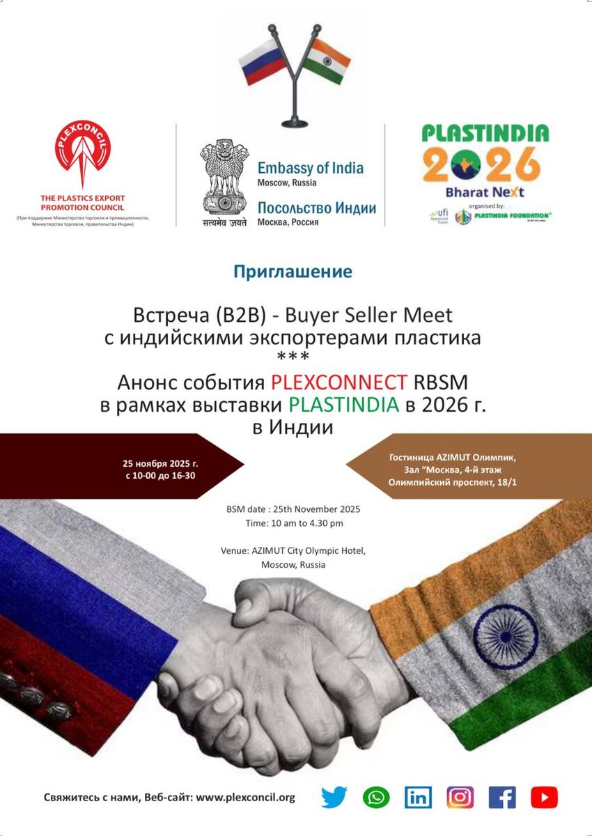 THE PLASTICS EXPORT PROMOTION COUNCIL При поддержке Министерства торговли и промышленности Индии. Посольство Индии Москва, Россия В рамках предстоящей выставки: PLASTINDIA 2026 Сегодня проходит Встреча (B2B) - Buyer Seller Meet с индийскими экспортерами *** Анонс события PLEXCONNECT RBSM в рамках выставки PLASTINDIA в 2026 г. в Индии 25 ноября 2025 г. с 10-00 до 16-30 Гостиница AZIMUT Олимпик, Зал "Москва, 4-й этаж Олимпийский проспект, 18/1 www.plexconcil.org #выставка