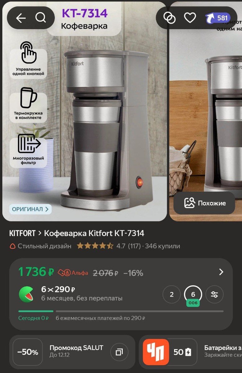 Кофеварка Kitfort КТ-7314 за 1736₽ https://market.yandex.ru/cc/85syEc