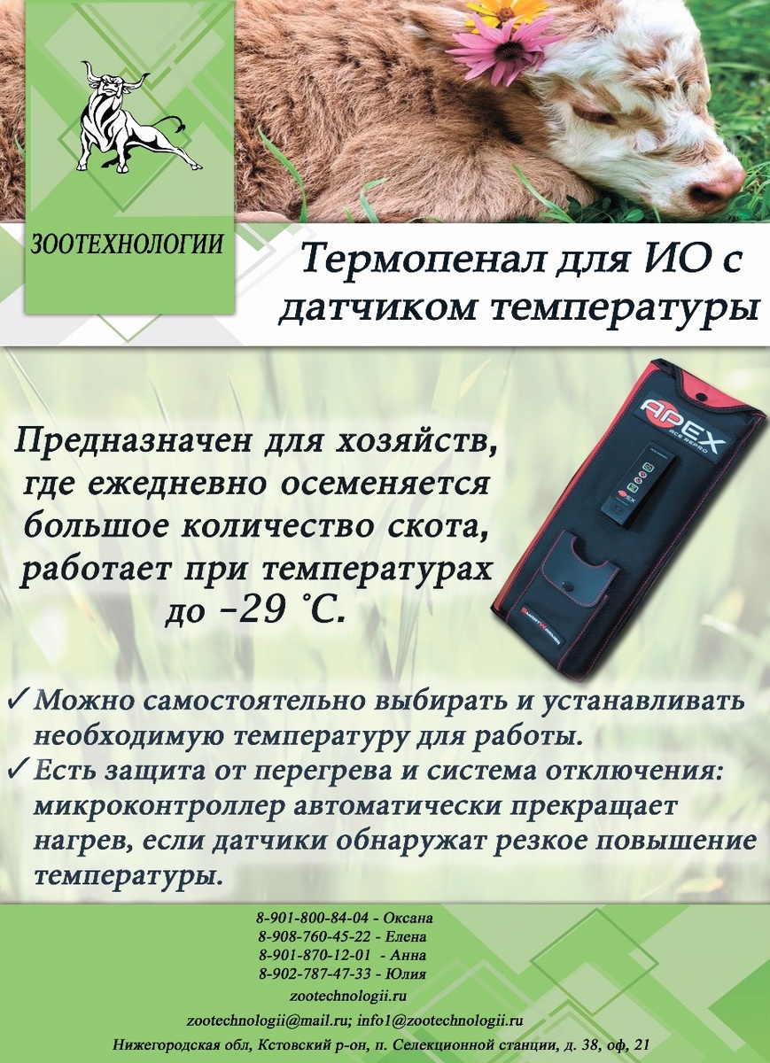 Добрый день. В продаже термопенал для шприцов искусственного осеменения (ИО) APEX — электронное устройство в виде чехла, которое сохраняет температуру шприцов с биологическим материалом (спермой животных) до места осеменения. Особенности термопенала: ✔️снижает риск повреждения спермодозы из-за температурных скачков при переносе шприца от места подготовки до места осеменения; ✔️позволяет переносить одновременно несколько снаряжённых шприцов в оптимальной температурной среде; ✔️предоставляет удобное и гигиеничное место для хранения шприцов во время работы. Применение: термопенал используют, например: ✅Осеменение молочных коров — в коровнике при переносе шприца от места снаряжения до места осеменения. ✅Осеменение на улице — термопенал сохраняет снаряжённый шприц в оптимальном температурном режиме при работе из машины или перемещении пешком. ✅Загон для скота — термопенал можно повесить рядом с загоном для быстрого и удобного доступа к снаряжённым шприцам. Характеристики ✅Рабочий тем