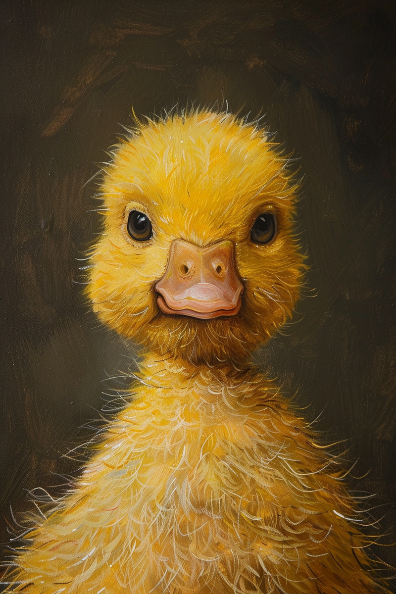 Промпт: A stylized humorous caricature painting in a close-up portrait with shallow depth of field of a fluffy yellow duckling. Exaggerated satirical proportions—oversized round eyes, large head, tiny body—and playful, witty expression. Expressive, sketchy linework with bold slightly rough outlines and textured oil/acrylic brushstrokes; raw, unpolished aesthetic. Dark, moody neutral background with high-contrast cinematic lighting; limited muted palette with one vivid yellow/orange accent; tactile brush texture, whimsical yet cinematic mood. A highly detailed oil painting. --ar 2:3 Понравились картины? Ставьте лайк, оставляйте комментарии и делитесь своими идеями для будущих шедевров!