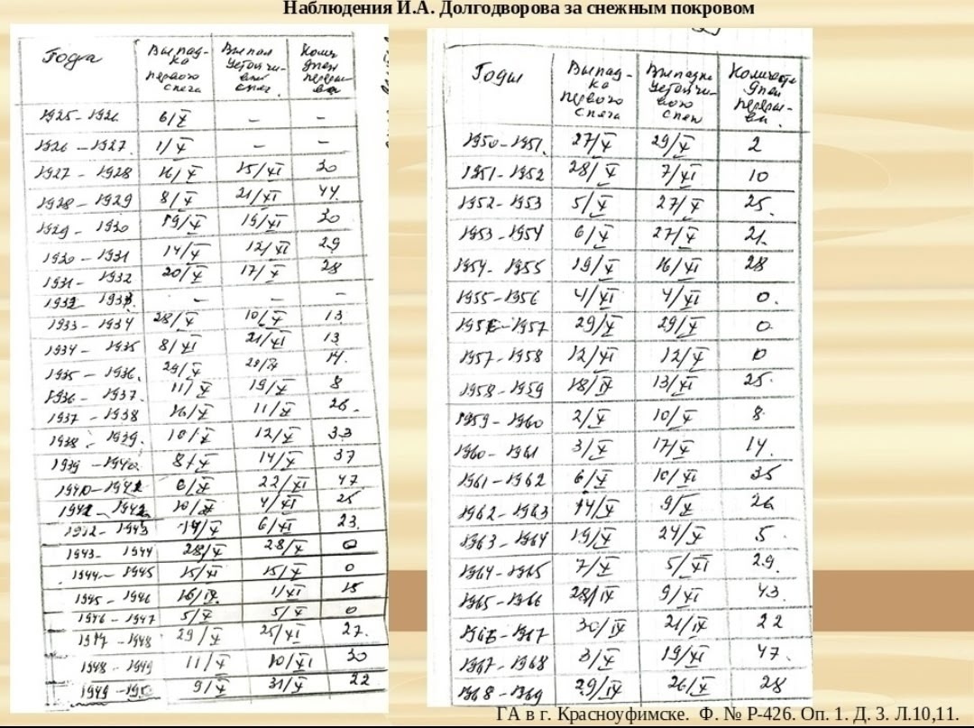 В архивных документах И.А. Долгодворова зафиксированы даты первого снега и появления устойчивого снежного покрова с 1925 по 1969 годы. Эти наблюдения позволяют проверить, насколько примета соответствовала действительности в разные годы. В ближайшее время мы поделимся интересными фактами о самой низкой температуре зимой в период с 1925 по 1969 годы. Следите за публикациями — будет любопытно! По информации городского архива
