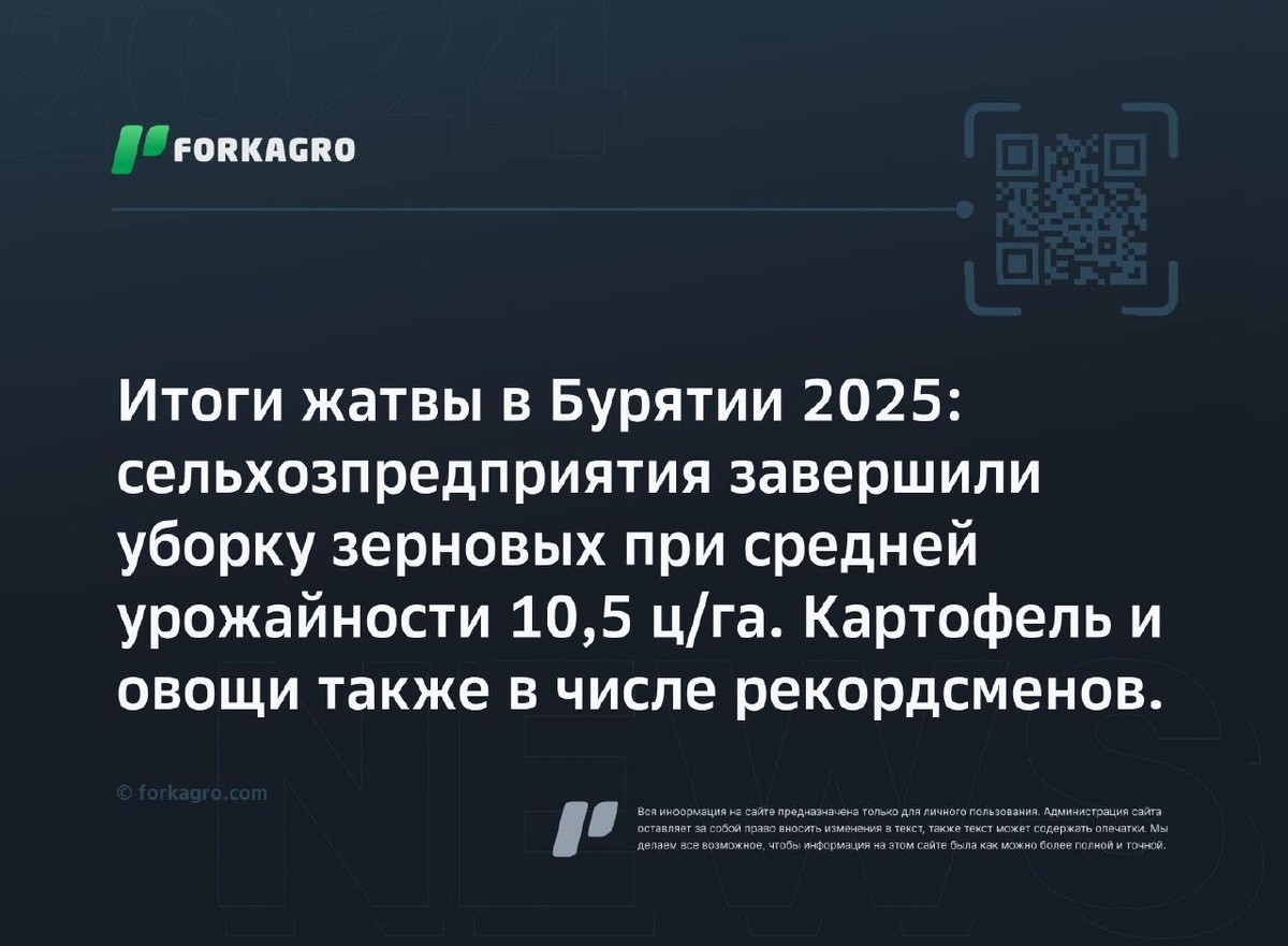 Итоги жатвы в Бурятии 2025: сельхозпредприятия завершили уборку зерновых при средней урожайности 10,5 ц/га. Картофель и овощи также в числе рекордсменов. Минсельхоз Бурятии сообщил, что уборка урожая 2025 года завершена. Из-за засухи 27,1 тыс. га исключены. Общий объем собранной зерновой культуры составил 46 тыс. тонн, средняя урожайность — 10,5 ц/га. Тункинский район лидирует по урожайности. Собрано также картофеля и овощей, показатели урожайности варьируются. Выращено масличных культур в два раза больше, чем годом ранее. Перейти к источнику