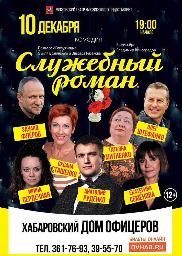 Спектакль "Служебный роман" ✔ Премьера Московского театра «Мюзик-холл» ✔ Новая сценическая интерпретация пьесы «Сослуживцы» ✔ Звёздный состав: Эдуард Флёров, Оксана Сташенко, Анатолий Руденко / Олег Штефанко, Екатерина Семёнова, Ирина Сердечная, Татьяна Митиенко ✔ Атмосфера классического советского кино в современном театральном прочтении ✔ Продолжительность — 2 часа, один антракт 📅 Когда: #10_декабря, 19:00 ⛳ Где: Дом офицеров Восточного военного округа, ул. Шевченко, 16 💳 Стоимость: 1800–4200 ₽ 📞 Контакты: +7 (4212) 617-693 Билеты 👉 Афиша Хабаровска. Куда сходить, экскурсии