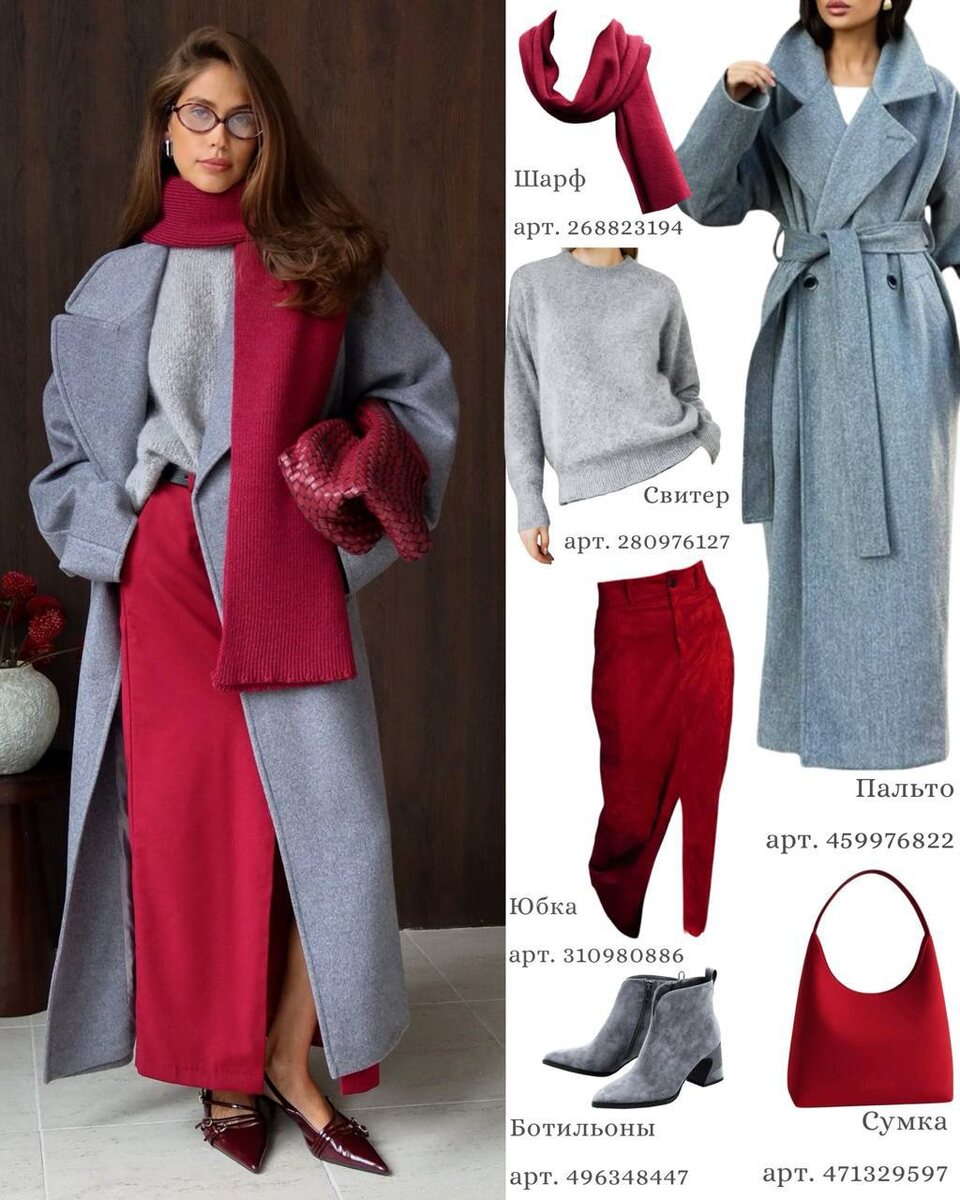 Зима — самое время добавить в свой гардероб немного огня. Когда вокруг царят серые улицы, короткие дни и теплые слои одежды, именно яркие акценты становятся тем самым способом вернуть себе энергию, выразительность и женственность. Красный и бордовый — два оттенка, которые никогда не подводят: они благородны, глубокие, уверенные и в то же время невероятно универсальны. Сегодня собрала для тебя 6 образов с WB, в которых эти цвета раскрываются по-новому: от элегантных сочетаний с серым до уютных монохромов. Каждый образ — это идея, как сочетать практичность зимней одежды со стильными деталями. Перейти прямо к данному посту в Telegram с активными ссылками на вещи Сочетание длинного серого пальто, мягкого базового свитера и эффектного малинового шарфа — это элегантность, которая не требует усилий. Красная юбка-миди и сумка в тон добавляют глубины и делают образ цельным. Такой образ идеален для встреч, прогулок по городу или атмосферных кафе. Совет: если хочешь усилить акцент, добавь помаду