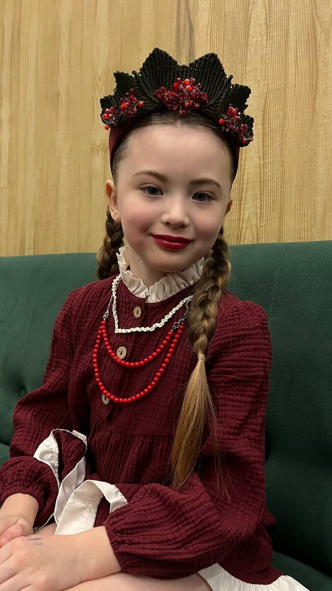 Всем доброе утро! Ободок в деле! Вчера дочка пела песню «Матушка-земля» в этом образе. А рядом фото-inspiration. Я использовала готовый ободок 172995305 wb. Сплела листики в технике макраме из полиэфирного шнура 1191353682 ozon, ягодки из стразового шнура. Ягодки из бусин 138126735 wb и проволоки 158098745 wb выполнила в технике wire wrap. Как вам идея и исполнение?