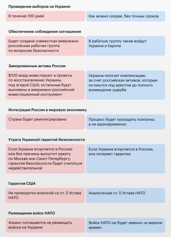 📰 Сравнительный анализ: «Красный» и «Синий» мирные планы — упущенный шанс или дорожная карта конфликта? Недавно в публичное поле попали документы, сравнивающие два возможных подхода к мирному урегулированию конфликта — условно обозначенные как «Красный» и «Синий» планы. Анализ этих пунктов позволяет увидеть, насколько далеко расходятся интересы сторон и где именно пролегает линия компромисса, который так и не был достигнут. Эти документы, по всей видимости, отражают эволюцию переговорных позиций, возможно, начиная с ранних стадий конфликта (Стамбульский формат 2022 года) и заканчивая поздними, более компромиссными требованиями. 🚩 «Красный план»: Максимум выгоды для России План, обозначенный на красном фоне, выглядит как набор требований, реализация которых была бы максимально выгодна для России и закрепляла бы достигнутые военные успехи. 🎯 Ключевые победы для России в «Красном плане»: Гарантированный нейтралитет (Главное требование): Отказ Украины от НАТО закрепляется на высш