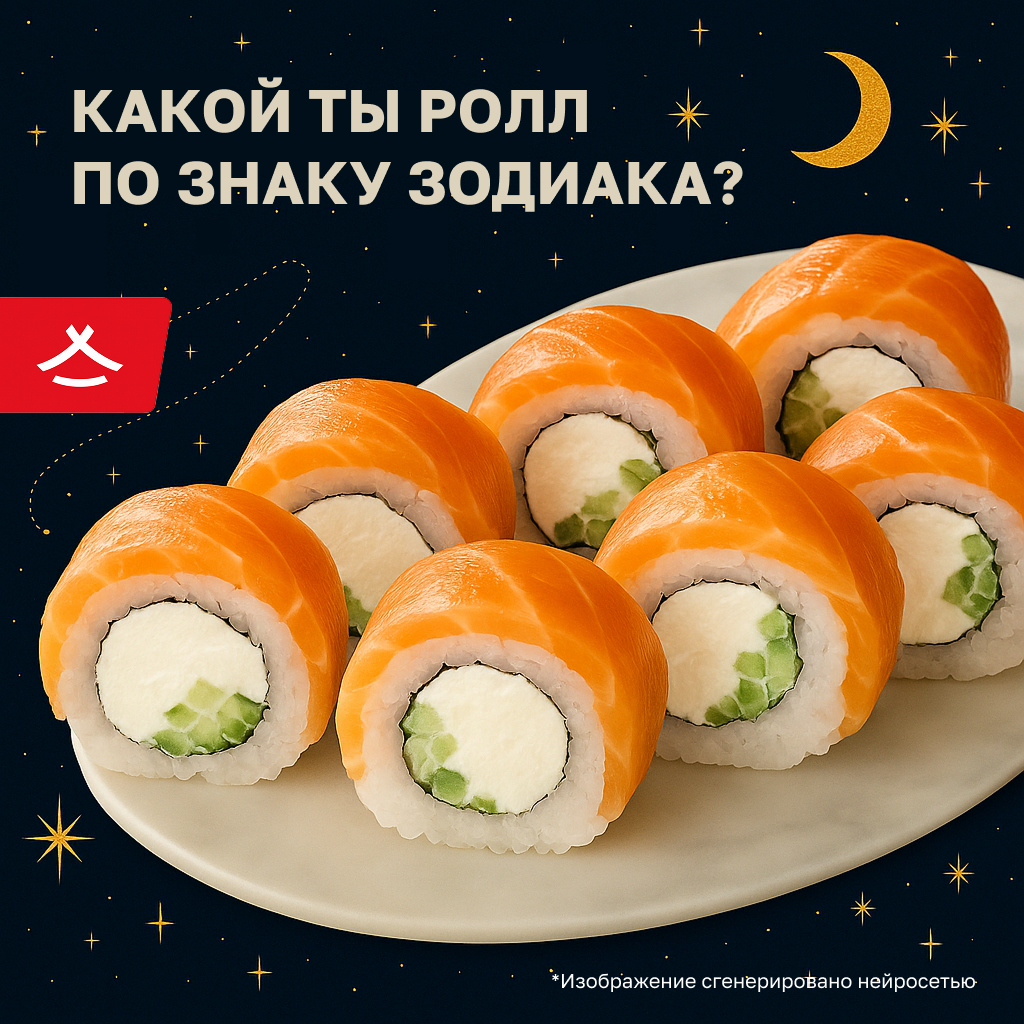 Задумывался, какой ролл отражает вашу душу и характер? Разбираем вашу суши-идентичность! Находите свой знак и узнавайте, какой ролл вам соответствует. Ролл «Спайси темпура» Горячий, хрустящий, с взрывным вкусом. Сразу заявляет о себе, действует напрямую и не терпит ожидания. Его главное оружие — скорость и яркость. Ролл «Филадельфия» Классика, которую все обожают. Нежный, сытный и надежный. Ценит комфорт, качество и чувственные наслаждения. Ради него можно нарушить все правила. Ролл «Калифорния» Яркий, многогранный, с обилием икры и соусов. Снаружи один, внутри — совсем другой. Идеальное воплощение двойственной, общительной и изменчивой натуры Близнецов. Ролл «Сырный лосось» Нежный, тающий во рту, подается теплым. Нуждается в заботе и комфорте. Его запеченная сырно-сливочная шапка с лососем напоминает о домашнем уюте и ностальгии. Ролл «Дракон» Эффектный, сложный, королевский. Его вид говорит сам за себя — он создан, чтобы производить впечатление и быть в центре внимания. Каппа маки (р