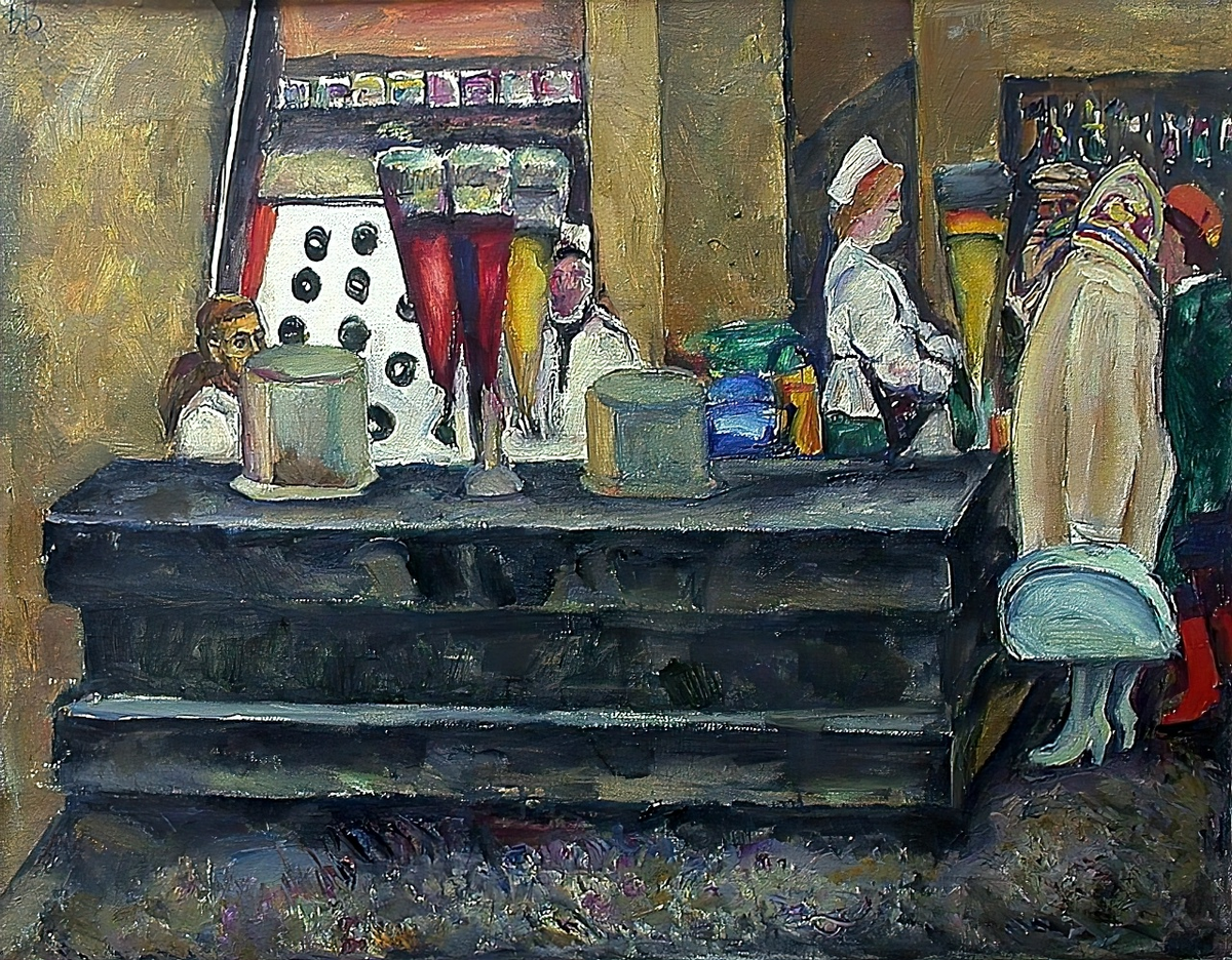 Коржевский Борис Георгиевич (11.04.1927,ст. Динская Кубанской области-10.01.2004,Москва).«Соки-воды».1982 год.Холст, масло;72х80 см.;(Музейное объединение «Музей Москвы»). Невесёлая картина. В жизни было веселей, но художник так мрачно видит. Коржевский Борис Георгиевич (11.04.1927,ст. Динская Кубанской области-10.01.2004,Москва).«Эскалатор.Час пик».(Авторская копия (3-й вариант) с картины 1970-х годов, хранящейся в Волжской картинной галерее г. Тольятти).1997 год.Холст, масло;120х78 см.;(Музейное объединение «Музей Москвы») И на этой картине веселья мало. А ведь было весело! Помните фильм "А я иду, шагаю по Москве!"? Как весело пел песню Михалков! Алексеев-Свинкин Александр Алексеевич (р.31.03.1952,Челябинск-Екатеринбург).«Приемный пункт стеклопосуды».1983 год.Двп, холст, масло;145х190 см.;(Екатеринбургский музей изобразительных искусств). И в этой картине тоска и грусть. А я помню, как весело мой одноклассник сдавал бутылки в приёмном пункте стеклотары! А веселился он потому, что