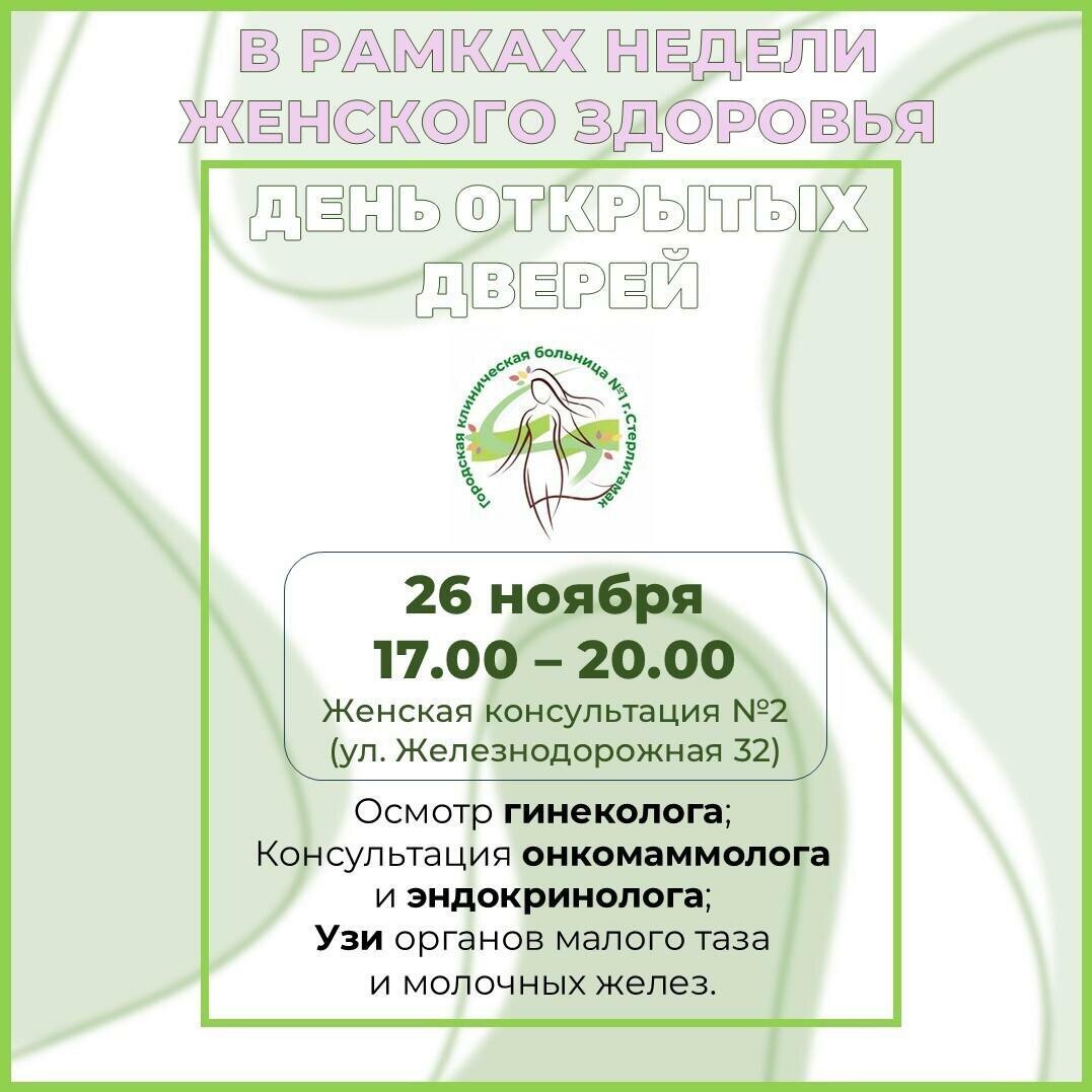 26 ноября в рамках Недели женского здоровья в женской консультации № 2 пройдёт День открытых дверей. У девушек и женщин есть уникальная возможность посетить в удобное для себя время сразу нескольких профильных специалистов - гинеколога, эндокринолога, онкомаммолога. И это еще не всё - будет проводиться УЗИ органов малого таза и молочных желёз. Главное преимущество - для визита не требуется запись. Нужно только посетить ЖК № 2, расположенную по адресу: г. Стерлитамак, ул. Железнодорожная, 32. Время приёма: с 17:00 до 20:00.
