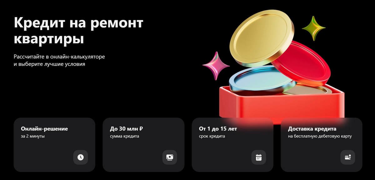 На официальной странице банка указано, что можно оформить кредит на ремонт квартиры без справок с суммой от 50 000 до 30 000 000 ₽ и сроком от 1 до 15 лет.