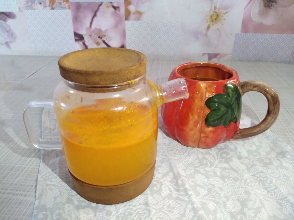 Всем привет! С этим чаем я познакомилась в ресторане в котором мы с коллегами всегда собирались после совещания. И мы всегда заказывали именно этот чай. Я уже не раз говорила, что унылую, осеннюю пору легче перенести, когда перед глазами есть яркие, сочные цвета. Я этой осенью много готовила из тыквы, рецепты есть на моём канале, которая тоже яркая. И этот чай тоже очень вкусный, яркий и радует глаза. Я использовала 100% сок облепихи, который сама заготовила ещё ранней осенью. Но конечно же можно использовать свежесобранные или замороженные ягоды. Розмарин, у меня сушеный, но если у вас есть веточка ароматного, свежего розмарина, то конечно же используйте её. Если у вас розмарин свежий, то вы просто заварите все ингредиенты сразу. А если, как у меня сушеный, то лучше сперва заварить розмарин. Чтобы лучше отдала аромат сушеная трава нужен крутой кипяток. Минут на 5 оставляем раскрыться пряностям. И затем отправляем все ингредиенты в чайничек, сок (если у вас ягоды, то лучше их нем
