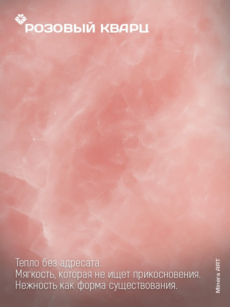 Розовый кварц — как внутренняя мягкость, которая не делает себя видимой, пока ты сама не замедлишься. Он гладкий, чуть шелковистый, с матовой поверхностью или лёгкой прозрачностью. На свету может казаться молочным или нежно-персиковым. Не сияет, не давит — просто лежит в руке так, будто там и должен быть. С ним не начинается — но, возможно, что-то отпускается. Он не открывает чувства. Он позволяет их не прятать. ___________ Minera ART — направление, в котором мы пробуем почувствовать каждый минерал — и делимся результатом в своей группе.