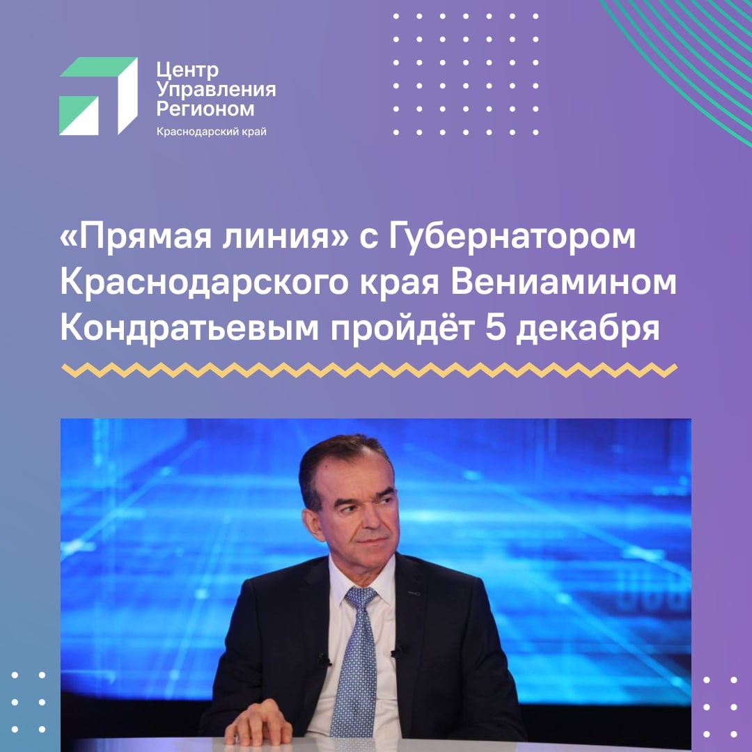 Губернатор Краснодарского края Вениамин Кондратьев 5 декабря проведёт «Прямую линию». Она начнётся в 12:00 в прямом эфире телеканала «Кубань 24». Специалисты начали принимать вопросы жителей региона с 25 ноября. Их можно задать любым удобным способом: 🔹на Платформе обратной связи на портале «Госуслуги»; 🔹через чат-бот в мессенджере MAX — Вопрос Губернатору Краснодарского края @direct_line_krasnodar_krai_bot; 🔹по телефону: 8 (861) 268-60-44.