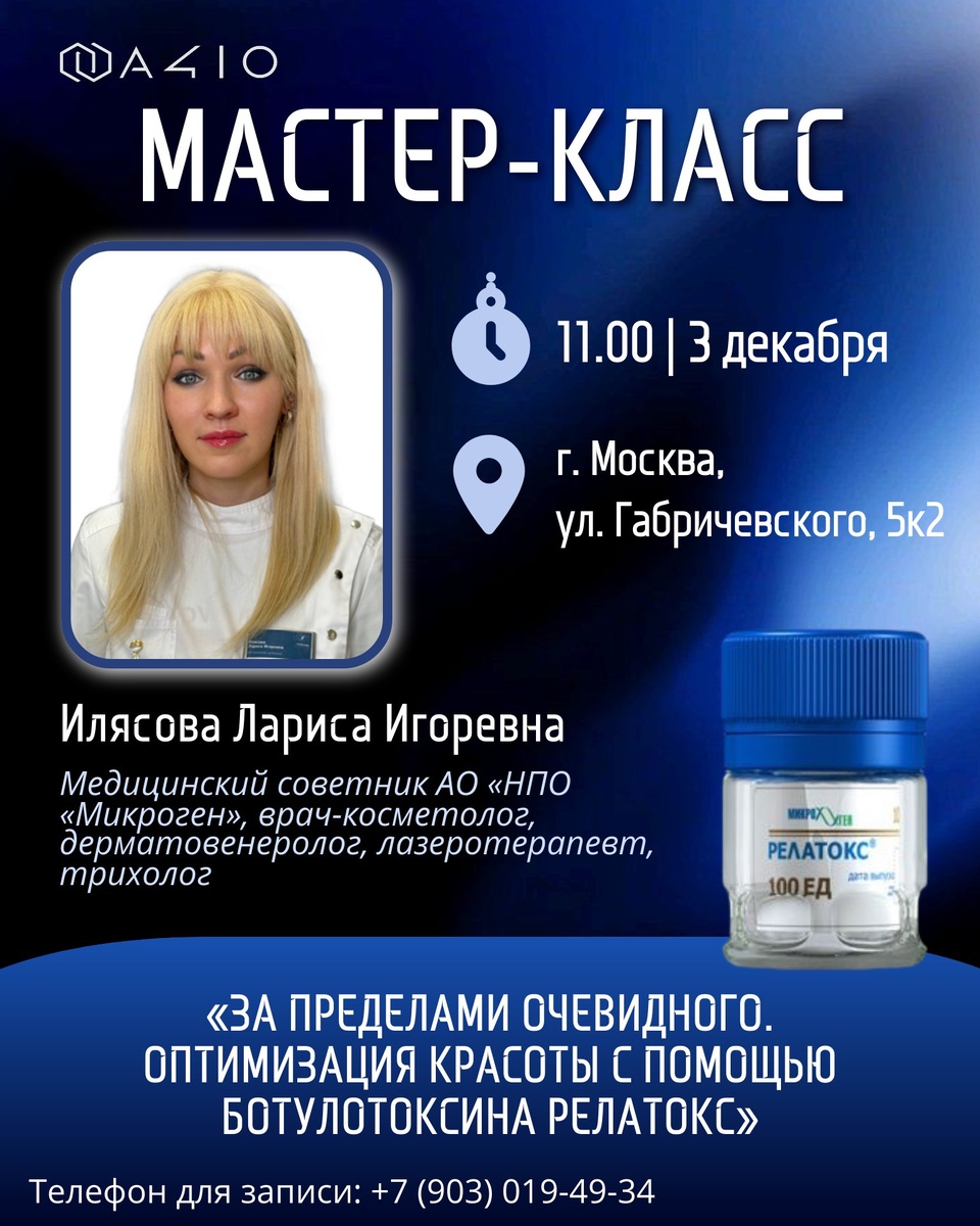 !😍 Тема 📘: «За пределами очевидного. оптимизация красоты с помощью ботулотоксина Релатокс»💉 📆Дата: 3 декабря ⏰Время: 11:00 🏢Место: г. Москва, ул. Габричевского, д. 5, стр. 2., 4 этаж. 🗣️Спикер: — Илясова Лариса Игоревна - Медицинский советник АО «НПО «Микроген», врач-косметолог, дерматовенеролог, лазеротерапевт, трихолог Программа⏳: 11:00-13:00 Теоретическая часть. 13:00-13:30 Кофе-брейк☕ 13:30-15:30 Практическая часть. 🌟Условия участия уточняйте у менеджера. ⚡️ Зарегистрироваться можно по номеру 📱: +7 (903) 019-49-34 или на сайте 💻: A410.ru ⚡️Для получения полного прайс-листа переходите по ссылке 👉 http://clck.ru/38NMpp #Обучение_и_вебинары