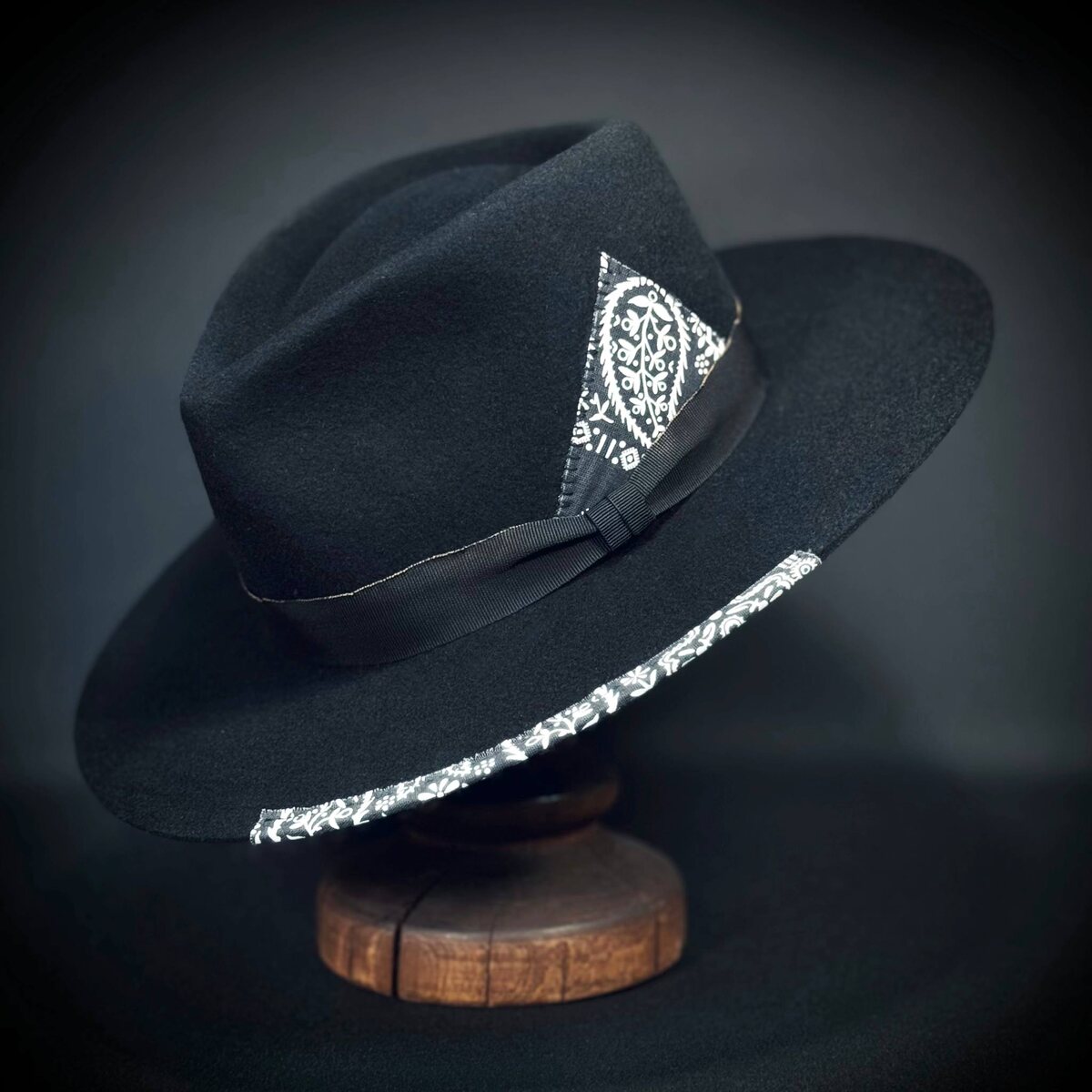 Fedora Cliff Patterns Строгая черная шляпа с восьмисантиметровыми полями дополнена контрастными деталями из ткани с восточным узором пейсли. Два лаконичных лоскута на тулье и крае поля добавляют фактуры и настроения. Размерный ряд: от 52 до 64, включая промежуточные размеры (52.5, 53.5 и т.д.) Цена: 12 000 ₽ Все шляпы изготавливаются индивидуально под заказ в нашей мастерской. Заказать или просто спросить:) #fedora #cliff #чёрный #8см