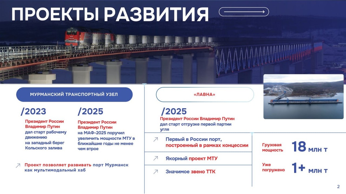 Базовый инвестпроект – Мурманский транспортный узел. Второй проект – газификация. Подписана детальная программа газификации. Получено положительное заключение главгосэкспертизы.