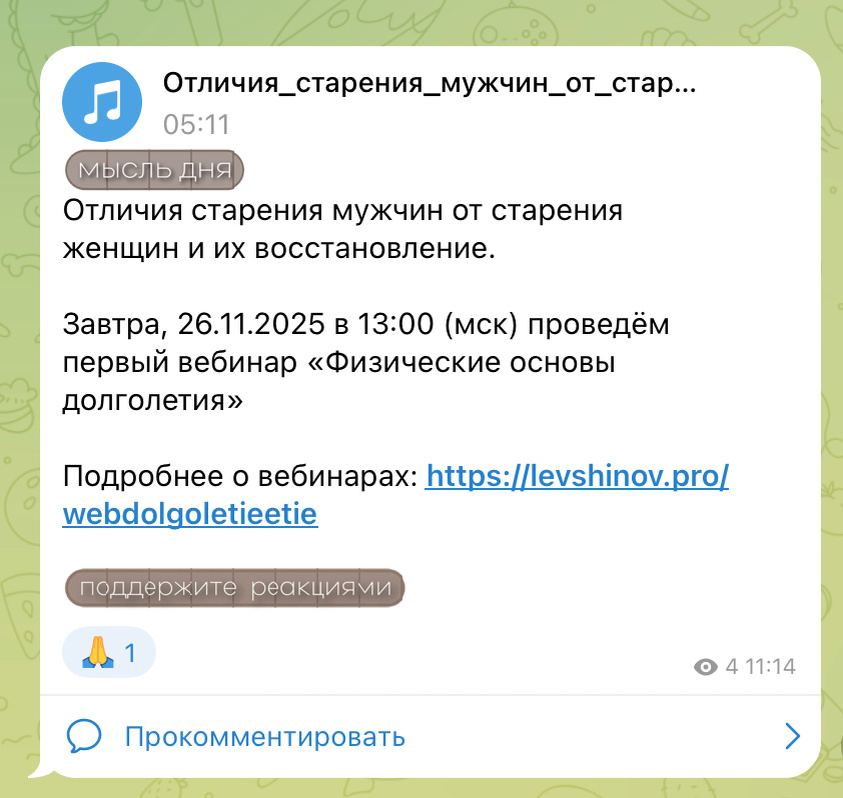 В новом Телеграм-канале «Долголетие» я выложил аудио о том, как мужчины и женщины стареют по-разному — и почему процессы восстановления у нас тоже идут по-разному. В этом аудио я также объясняю: Переходите в канал, слушайте аудио, подписывайтесь — дальше мы будем глубже разбирать тему долголетия. Ссылка 👉 https://t.me/+fn1UMXLhrFMxZDky
