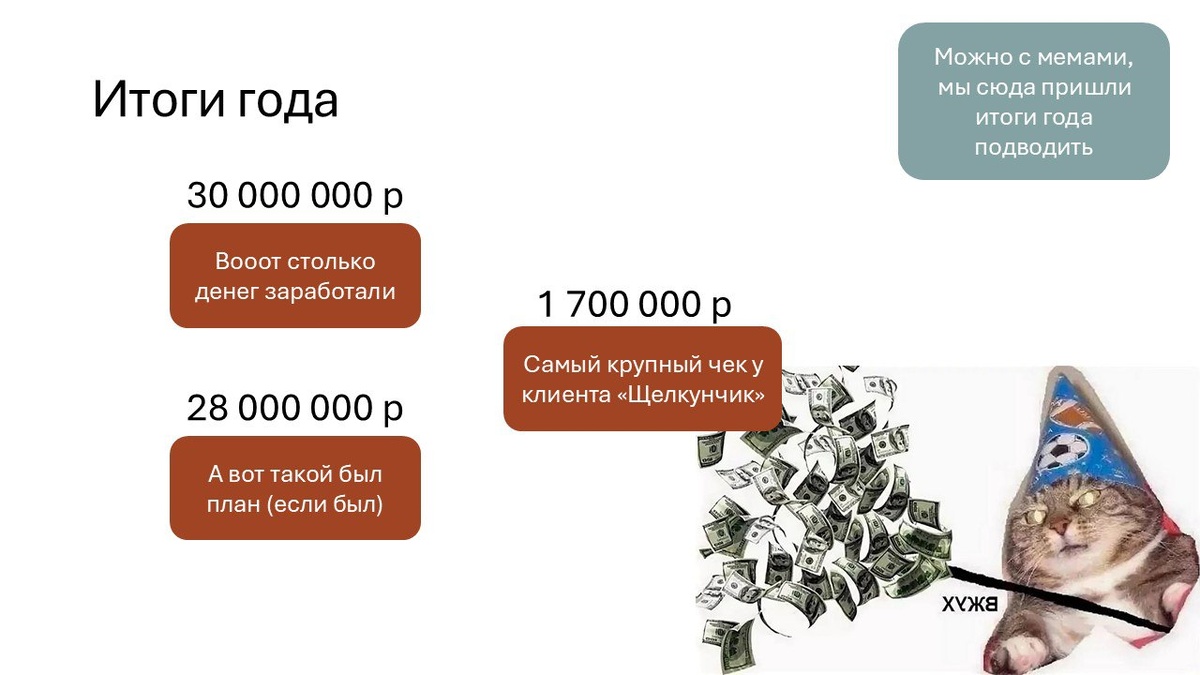Новогодний спешл для Sales Kit-a Почесать за ушком сейлов - самое важное, что нужно успеть сделать в декабре. Они классные, вы с ними много достигли и все такое прочее 🥰 Это 6 слайдов с моими предложениями о том, как рассказать про итоги года для сбыта. Три основные идеи: ⭐️Коротко ⭐️Мы заработали денег. И будет только больше ⭐️Все молодцы. А некоторые прям экстра Молодцы Кстати, в боте есть запись вебинара про Sales Kit-ы B2B бот с вебинарами и кейс-клубом | Моя Доска