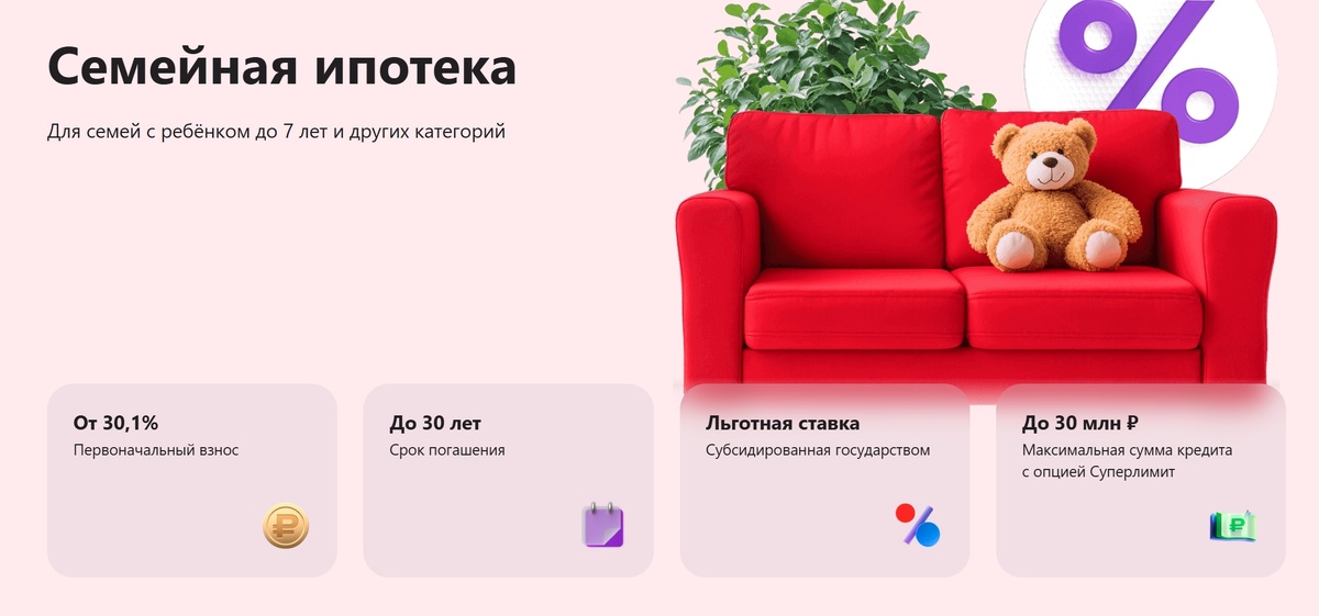 - Минимальный первоначальный взнос — от ~30,1 % стоимости недвижимости.