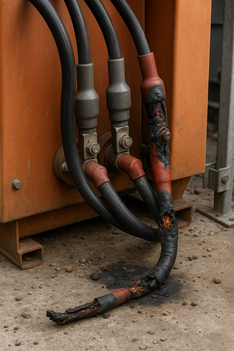 Искали 2 часа. Нашли: муфта оплавилась, изоляция ушла в уголь. Причина?