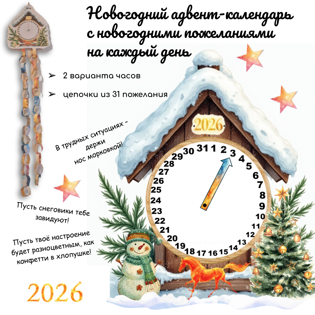 Новогодний адвент-календарь в ожидании Нового года с новогодними пожеланиями на каждый день "Часы". Ждёте Новый год? Давайте ждать вместе! Будем сверять время по новогодним часам адвент-календаря и срезать по одному новогоднему пожеланию каждый день! Данный новогодний календарь в ожидании Нового года представляет собой изображение старинных часов с циферблатом чисел от 1 до 31 и двумя цепочками из 31 новогоднего пожелания. Такие часы удобно прикрепить на стену, дверь или доску, чтобы ребёнок мог перемещать стрелку часов или раскрашивать соответствующий цифровой сегмент, а также срезать звено из цепочек новогодних пожеланий. Изготовить такой адвент-календарь очень легко по подробной инструкции и представленным фотографиям каждого из этапов. Все новогодние пожелания (31 пожелание) составлены в короткой и шуточной форме в зимне-новогодней тематике. Заряжайтесь новогодним настроением! Скачать можно по ссылке: Или перейти на страницу вконтакте: vk.com/4popugaya
