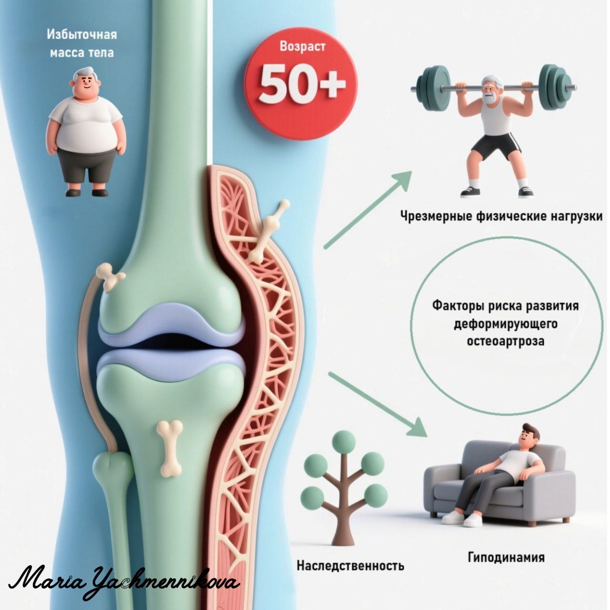 ДЕФОРМИРУЮЩИЙ ОСТЕОАРТРОЗ: НЕ ПРОСТО «ОТЛОЖЕНИЕ СОЛЕЙ» Котиева Н., Ячменникова М. Деформирующий остеоартроз (ДОА) — это не просто хруст в суставах с возрастом. Это хроническое прогрессирующее заболевание, при котором разрушается суставной хрящ, а затем и подлежащая кость [1]. Вопреки мифу, это не «отложение солей», а сложный процесс, где ключевую роль играет дисбаланс между разрушением и восстановлением тканей. Чаще всего болезнь атакует суставы, несущие наибольшую нагрузку: коленные (гонартроз) и тазобедренные (коксартроз). Нередко страдают суставы кистей рук и позвоночник [2]. Почему возникает остеоартроз? Первичный (идиопатический): возникает без явной причины, часто связан с генетической предрасположенностью и возрастными изменениями [1]. Вторичный: развивается как следствие травмы, врожденных аномалий (дисплазии), воспалительных заболеваний (например, ревматоидного артрита) или метаболических нарушений [1]. Факторы риска развития остеоартроза, на которые стоит обратить внима